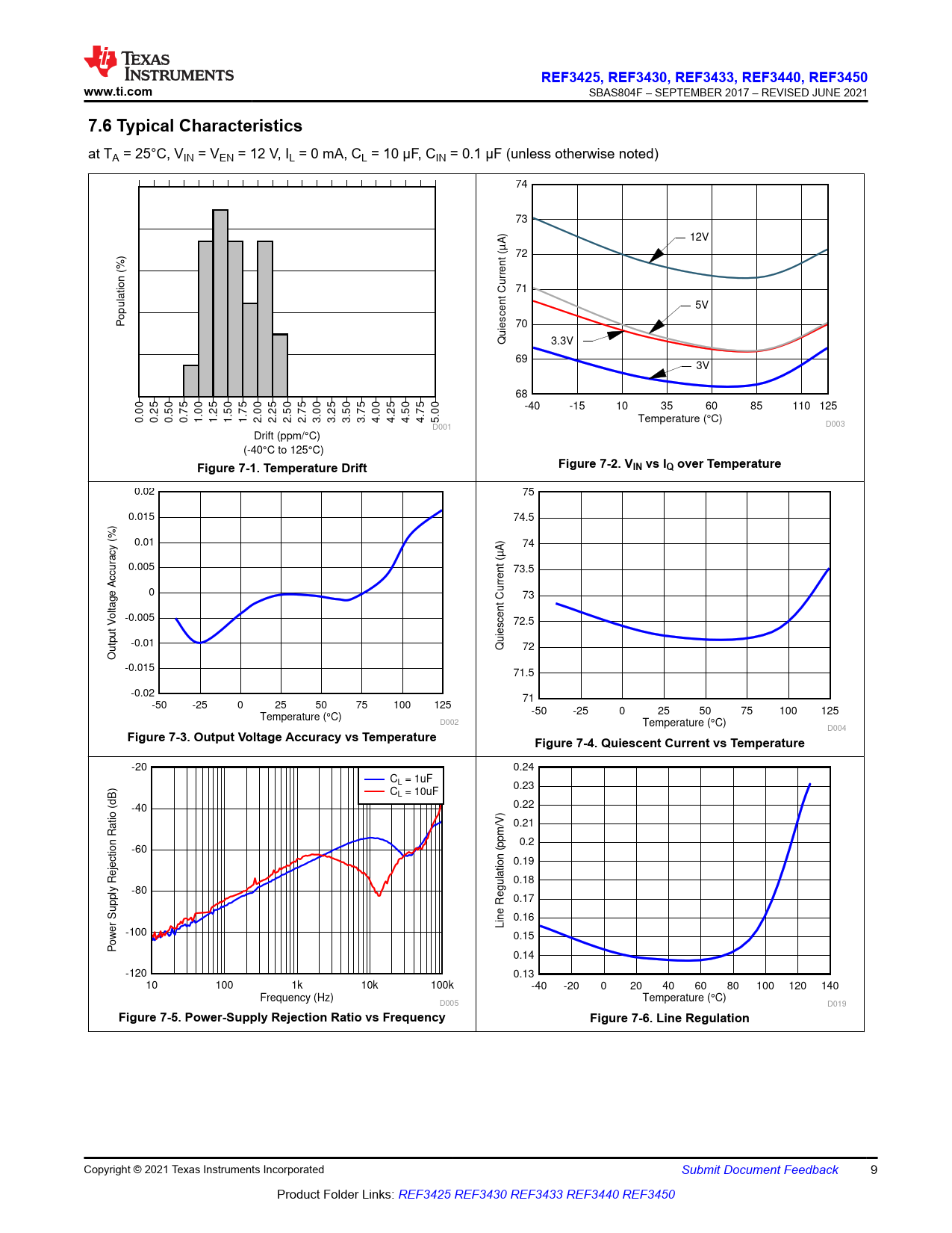 REF3425, REF3430, REF3433, REF3440. , REF3450. www.ti.com. 7.6 Typical Characteristics. Figure 7-1. Temperature Drift