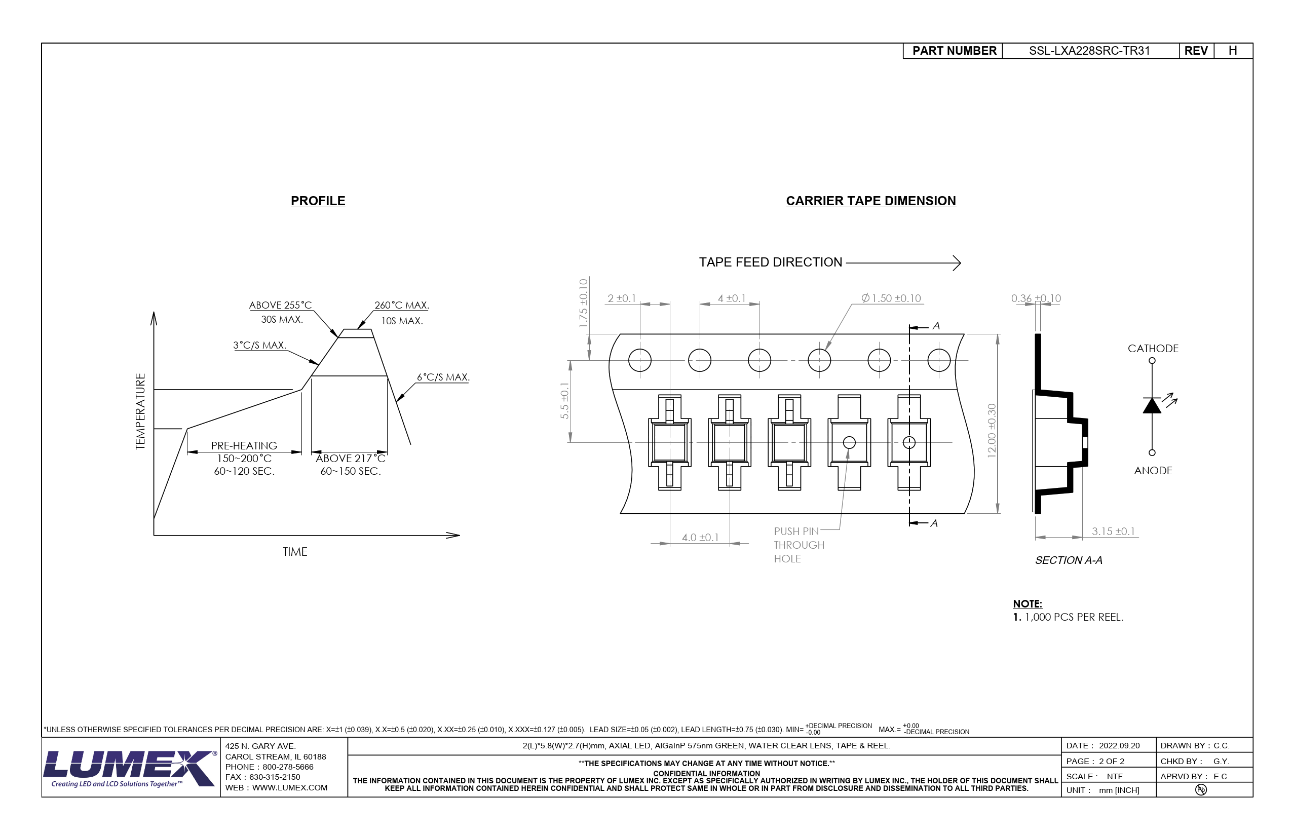 1,000 PCS PER REEL. *UNLESS OTHERWISE SPECIFIED TOLERANCES PER DECIMAL PRECISION ARE: X= + ±1 (±0.039), X.X=±0.5 (±0.020), X.XX=±0.25 (±0.010), X.XXX=±0.127 (±0.005). LEAD SIZE=±0.05 (±0.002), LEAD LENGTH=±0.75 (±0.030). MIN= MAX.= +DECIMAL PRECISION 0.00 -0.00 -DECIMAL PRECISION 425 N. GARY AVE. 2(L)*5.8(W)*2.7(H)mm, AXIAL LED, AlGaInP 575nm GREEN, WATER CLEAR LENS, TAPE & REEL. DATE: 2022.09.20 DRAWN BY:C.C. CAROL STREAM, IL 60188 PAGE: 2 OF 2 CHKD BY: G.Y. PHONE:800-278-5666