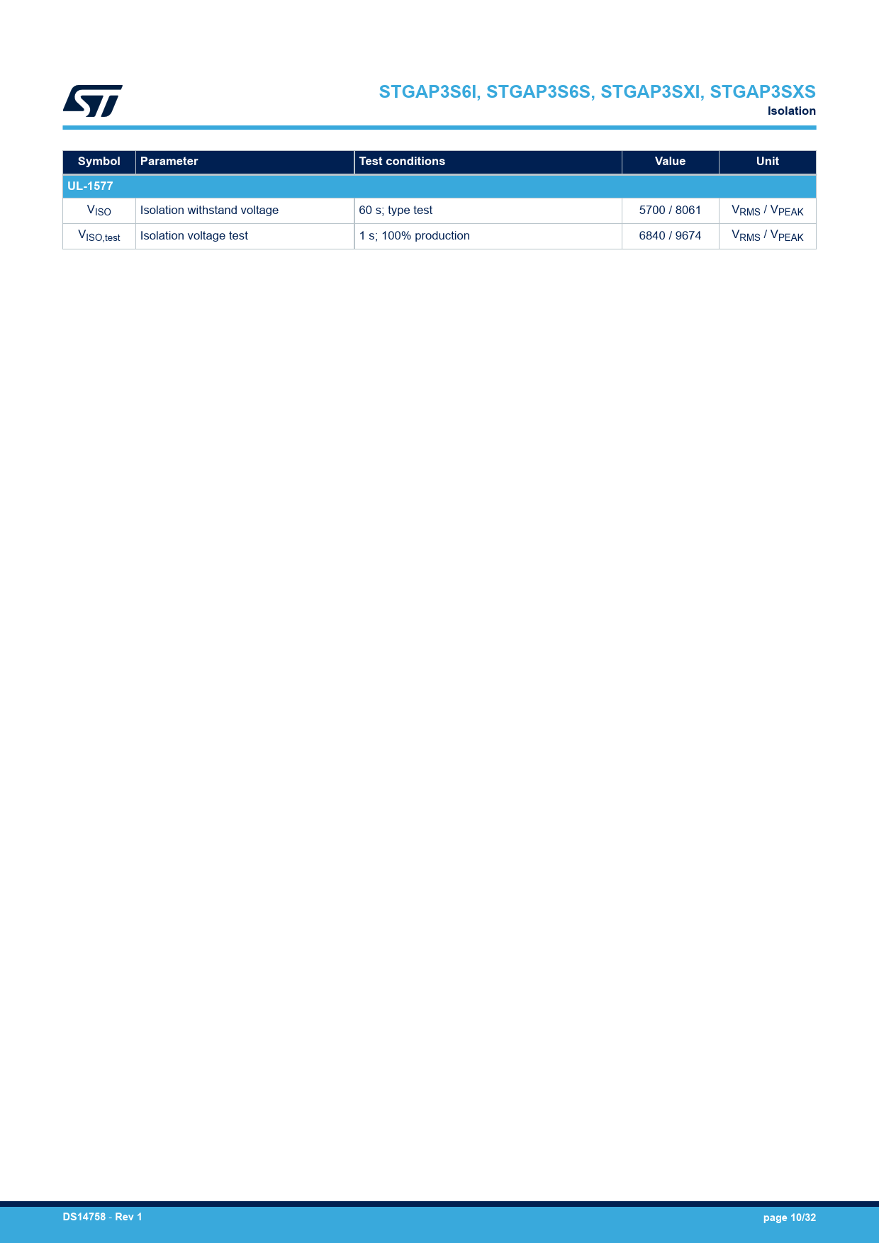STGAP3S6I, STGAP3S6S, STGAP3SXI, STGAP3SXS. Isolation. Symbol. Parameter. Test conditions. Value. Unit. UL-1577. DS14758. Rev 1. page 10/32