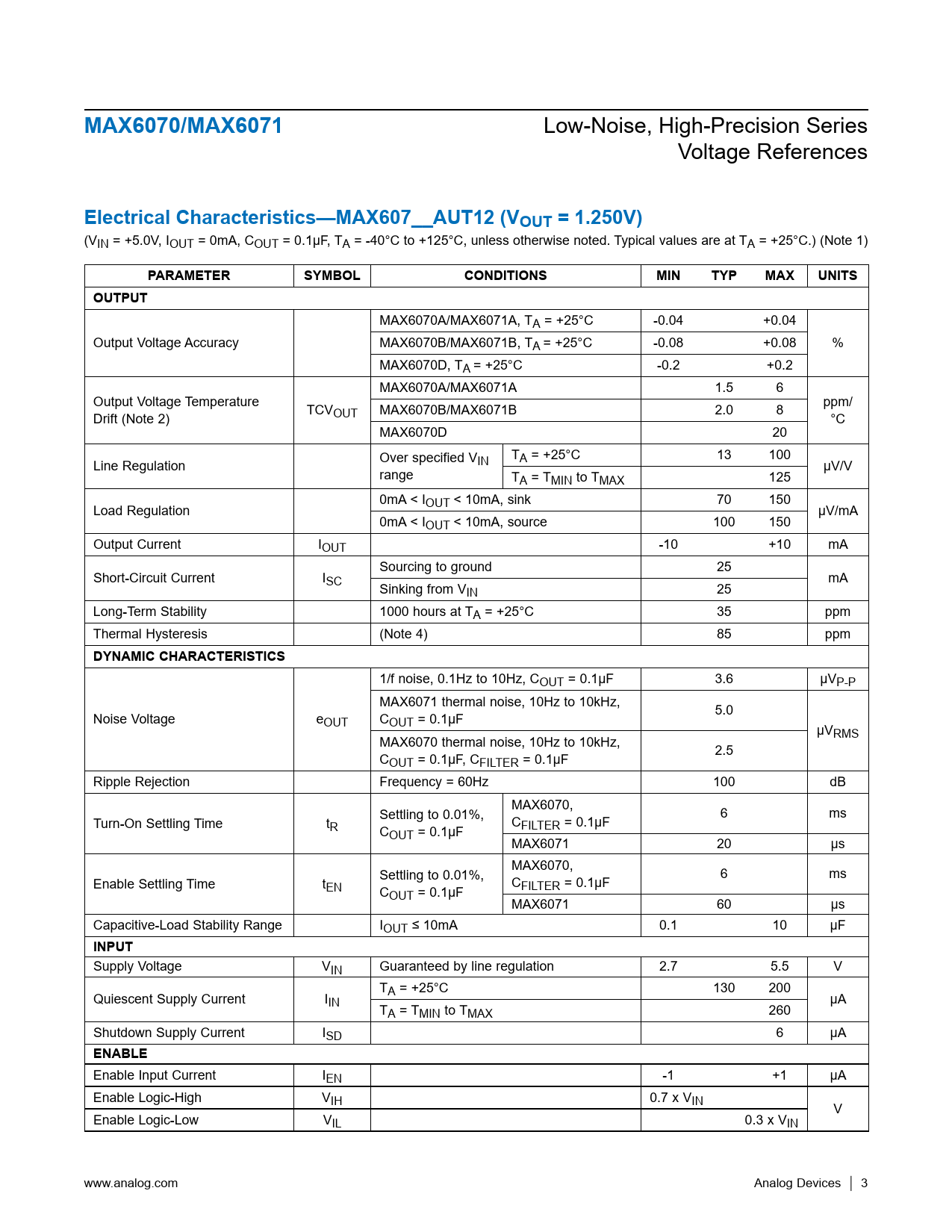 MAX6070/MAX6071 Low-Noise, High-Precision Series Voltage References Electrical Characteristics—MAX607__AUT12 (VOUT = 1.250V) (VIN = +5.0V, IOUT = 0mA, COUT = 0.1µF, TA = -40°C to +125°C, unless otherwise noted. Typical values are at TA = +25°C.) (Note 1) PARAMETERSYMBOLCONDITIONSMINTYPMAXUNITSOUTPUT MAX6070A/MAX6071A, TA = +25°C -0.04 +0.04 Output Voltage Accuracy MAX6070B/MAX6071B, TA = +25°C -0.08 +0.08 % MAX6070D, TA = +25°C -0.2 +0.2 MAX6070A/MAX6071A 1.5 6 Output Voltage Temperature ppm/ Drift (Note 2) TCVOUT MAX6070B/MAX6071B 2.0 8 °C MAX6070D 20 T Line Regulation Over specified VIN A = +25°C 13 100 range µV/V TA = TMIN to TMAX 125 0mA < I Load Regulation OUT < 10mA, sink 70 150 µV/mA 0mA < IOUT < 10mA, source 100 150 Output Current IOUT -10 +10 mA Sourcing to ground 25 Short-Circuit Current ISC mA Sinking from VIN 25 Long-Term Stability 1000 hours at TA = +25°C 35 ppm Thermal Hysteresis (Note 4) 85 ppm DYNAMIC CHARACTERISTICS 1/f noise, 0.1Hz to 10Hz, COUT = 0.1µF 3.6 µVP-P MAX6071 thermal noise, 10Hz to 10kHz, Noise Voltage eOUT COUT = 0.1µF 5.0 µVRMS MAX6070 thermal noise, 10Hz to 10kHz, COUT = 0.1µF, CFILTER = 0.1µF 2.5 Ripple Rejection Frequency = 60Hz 100 dB MAX6070, Turn-On Settling Time t Settling to 0.01%, R C C FILTER = 0.1µF 6 ms OUT = 0.1µF MAX6071 20 µs MAX6070, Enable Settling Time t Settling to 0.01%, EN C C FILTER = 0.1µF 6 ms OUT = 0.1µF MAX6071 60 µs Capacitive-Load Stability Range IOUT ≤ 10mA 0.1 10 µF INPUT Supply Voltage VIN Guaranteed by line regulation 2.7 5.5 V T Quiescent Supply Current I A = +25°C 130 200 IN µA TA = TMIN to TMAX 260 Shutdown Supply Current ISD 6 µA ENABLE Enable Input Current IEN -1 +1 µA Enable Logic-High VIH 0.7 x VIN V Enable Logic-Low VIL 0.3 x VIN www.analog.com Analog Devices │ 3