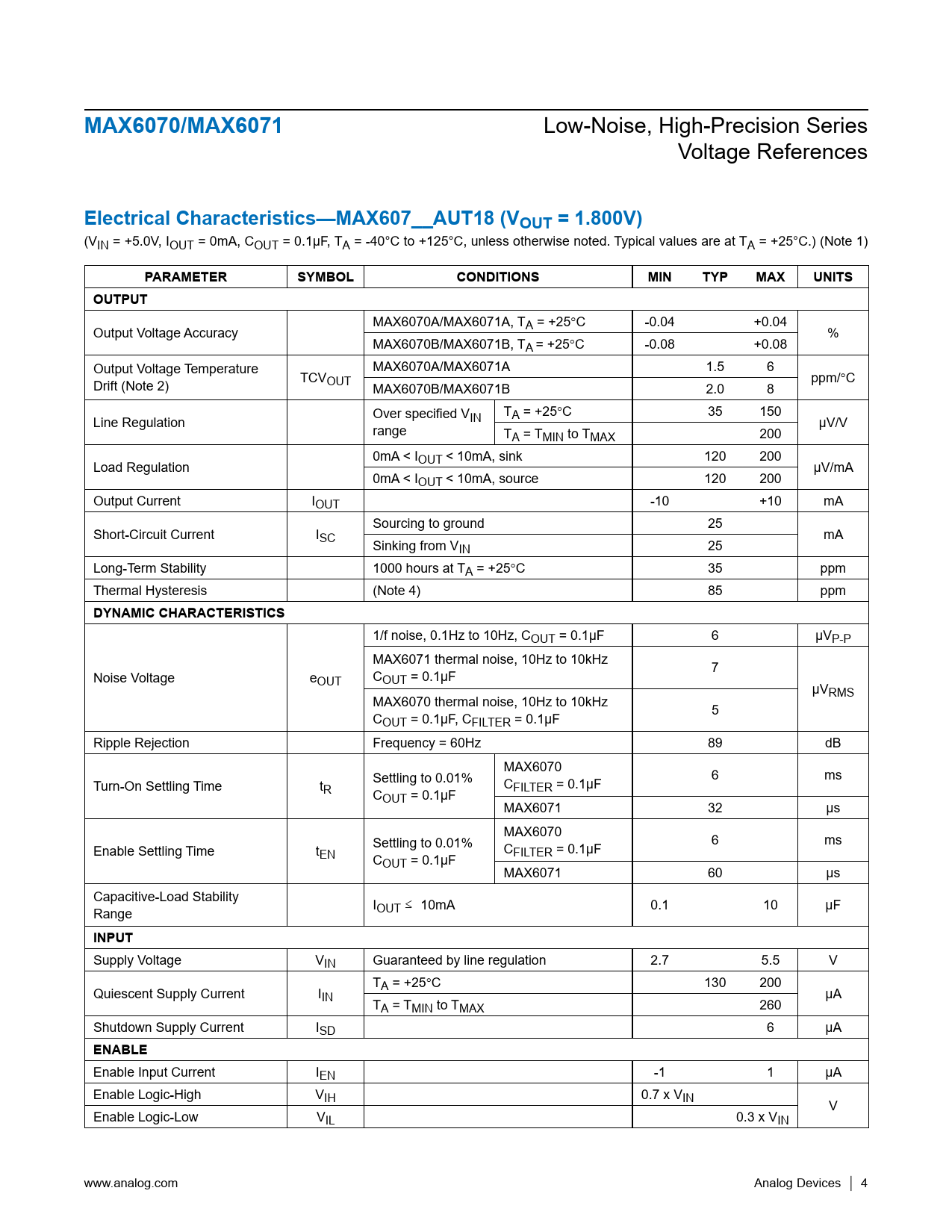 MAX6070/MAX6071. Electrical Characteristics—MAX607__AUT18 (VOUT = 1.800V). PARAMETER. SYMBOL. CONDITIONS. MIN. TYP. MAX. UNITS. OUTPUT