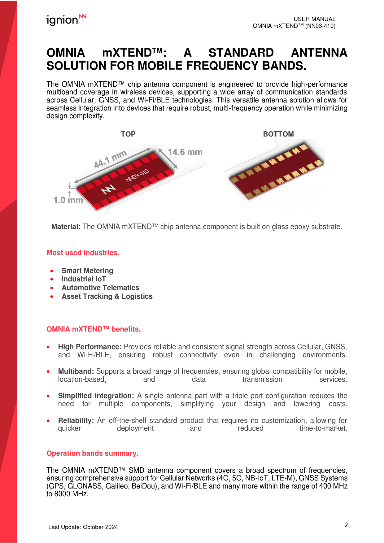 USER MANUAL OMNIA mXTENDTM (NN03-410) OMNIAmXTENDTM:ASTANDARDANTENNASOLUTION FOR MOBILE FREQUENCY BANDS. The OMNIA mXTEND™ chip antenna component is engineered to provide high-performance multiband coverage in wireless devices, supporting a wide array of communication standards across Cellular, GNSS, and Wi-Fi/BLE technologies. This versatile antenna solution allows for seamless integration into devices that require robust, multi-frequency operation while minimizing design complexity. TOPBOTTOMMaterial: The OMNIA mXTENDTM chip antenna component is built on glass epoxy substrate. Most used industries. • Smart Metering • Industrial IoT • Automotive Telematics • Asset Tracking & LogisticsOMNIA mXTEND™ benefits. • High Performance: Provides reliable and consistent signal strength across Cellular, GNSS, and Wi-Fi/BLE, ensuring robust connectivity even in challenging environments. • Multiband: Supports a broad range of frequencies, ensuring global compatibility for mobile, location-based, and data transmission services. • Simplified Integration: A single antenna part with a triple-port configuration reduces the need for multiple components, simplifying your design and lowering costs. • Reliability: An off-the-shelf standard product that requires no customization, allowing for quicker deployment and reduced time-to-market. Operation bands summary. The OMNIA mXTEND™ SMD antenna component covers a broad spectrum of frequencies, ensuring comprehensive support for Cellular Networks (4G, 5G, NB-IoT, LTE-M), GNSS Systems (GPS, GLONASS, Galileo, BeiDou), and Wi-Fi/BLE and many more within the range of 400 MHz to 8000 MHz. 2 Last Update: October 2024 Document Outline 1 AVAILABLE CONFIGURATIONS SUMMARY 2 DETAILED AVAILABLE CONFIGURATIONS 2.1 CELLULAR IoT + GNSS + Wi-Fi/BLE CONFIGURATION