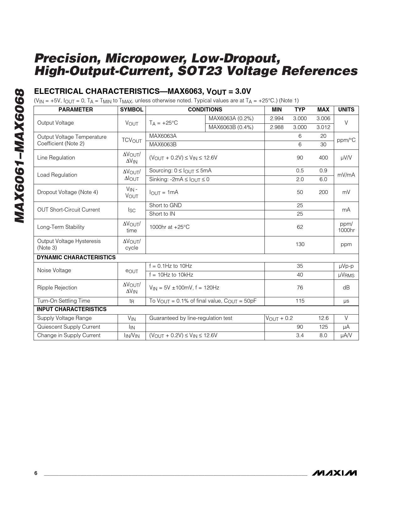Precision, Micropower, Low-Dropout, High-Output-Current, SOT23 Voltage References ELECTRICAL CHARACTERISTICS—MAX6063, VOUT = 3.0V