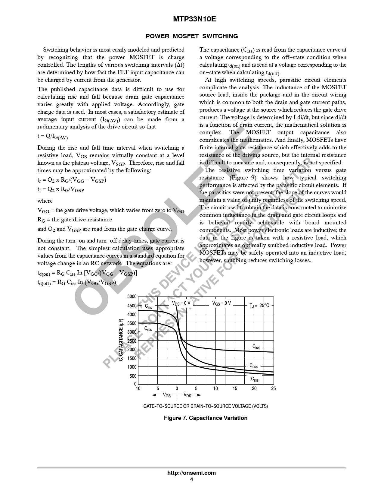 MTP33N10EPOWER MOSFET SWITCHING Switching behavior is most easily modeled and predicted The capacitance (Ciss) is read from the capacitance curve at by recognizing that the power MOSFET is charge a voltage corresponding to the off−state condition when controlled. The lengths of various switching intervals (Δt) calculating td(on) and is read at a voltage corresponding to the are determined by how fast the FET input capacitance can on−state when calculating td(off). be charged by current from the generator. At high switching speeds, parasitic circuit elements The published capacitance data is difficult to use for complicate the analysis. The inductance of the MOSFET calculating rise and fall because drain−gate capacitance source lead, inside the package and in the circuit wiring varies greatly with applied voltage. Accordingly, gate which is common to both the drain and gate current paths, charge data is used. In most cases, a satisfactory estimate of produces a voltage at the source which reduces the gate drive average input current (I current. The voltage is determined by Ldi/dt, but since di/dt G(AV)) can be made from a rudimentary analysis of the drive circuit so that is a function of drain current, the mathematical solution is complex. The MOSFET output capacitance also t = Q/IG(AV) complicates the mathematics. And finally, MOSFETs have During the rise and fall time interval when switching a finite internal gate resistance which effectively adds to the resistive load, VGS remains virtually constant at a level resistance of the driving source, but the internal resistance known as the plateau voltage, VSGP. Therefore, rise and fall is difficult to measure and, consequently, is not specified. times may be approximated by the following: The resistive switching time variation versus gate t resistance (Figure 9) shows how typical switching r = Q2 x RG/(VGG − VGSP) performance is affected by the parasitic circuit elements. If tf = Q2 x RG/VGSP the parasitics were not present, the slope of the curves would where maintain a value of unity regardless of the switching speed. V The circuit used to obtain the data is constructed to minimize GG = the gate drive voltage, which varies from zero to VGG common inductance in the drain and gate circuit loops and RG = the gate drive resistance is believed readily achievable with board mounted and Q2 and VGSP are read from the gate charge curve. components. Most power electronic loads are inductive; the During the turn−on and turn−off delay times, gate current is data in the figure is taken with a resistive load, which not constant. The simplest calculation uses appropriate approximates an optimally snubbed inductive load. Power values from the capacitance curves in a standard equation for MOSFETs may be safely operated into an inductive load; voltage change in an RC network. The equations are: however, snubbing reduces switching losses. td(on) = RG Ciss In [VGG/(VGG − VGSP)] td(off) = RG Ciss In (VGG/VGSP) 5000 VDS = 0 V VGS = 0 V 4500 C T iss J = 25°C 4000 3500 C 3000 rss ANCE (pF) 2500 ACIT C 2000 iss C, CAP 1500 1000 Coss 500 Crss 010 5 0 5 10 15 20 25 VGS VDS GATE−TO−SOURCE OR DRAIN−TO−SOURCE VOLTAGE (VOLTS) Figure 7. Capacitance Variationhttp://onsemi.com4