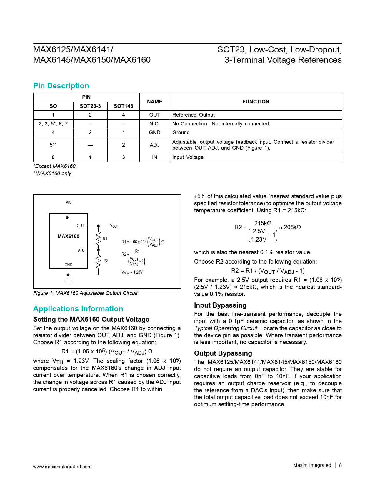 1 2 4 OUT Reference Output 2, 3, 5*, 6, 7 — — N.C. No Connection. Not internally connected. 4 3 1 GND Ground 5** — 2 ADJ Adjustable output voltage feedback input. Connect a resistor divider between OUT, ADJ, and GND (Figure 1). 8 1 3 IN Input Voltage *Except MAX6160. **MAX6160 only. ±5% of this calculated value (nearest standard value plus VIN specified resistor tolerance) to optimize the output voltage temperature coefficient. Using R1 = 215kΩ: IN OUT V 215kΩ OUT R2 = ≈ 208kΩ  2.5V