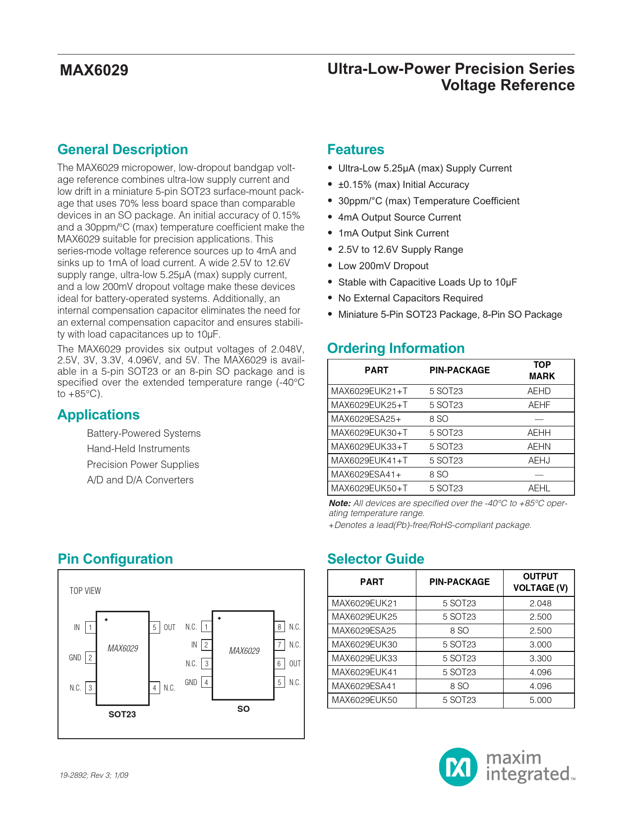 MAX6029ESA25+ 8 SO — Battery-Powered Systems MAX6029EUK30+T 5 SOT23 AEHH Hand-Held Instruments MAX6029EUK33+T 5 SOT23 AEHN Precision Power Supplies MAX6029EUK41+T 5 SOT23 AEHJ MAX6029ESA41+ 8 SO — A/D and D/A Converters MAX6029EUK50+T 5 SOT23 AEHL