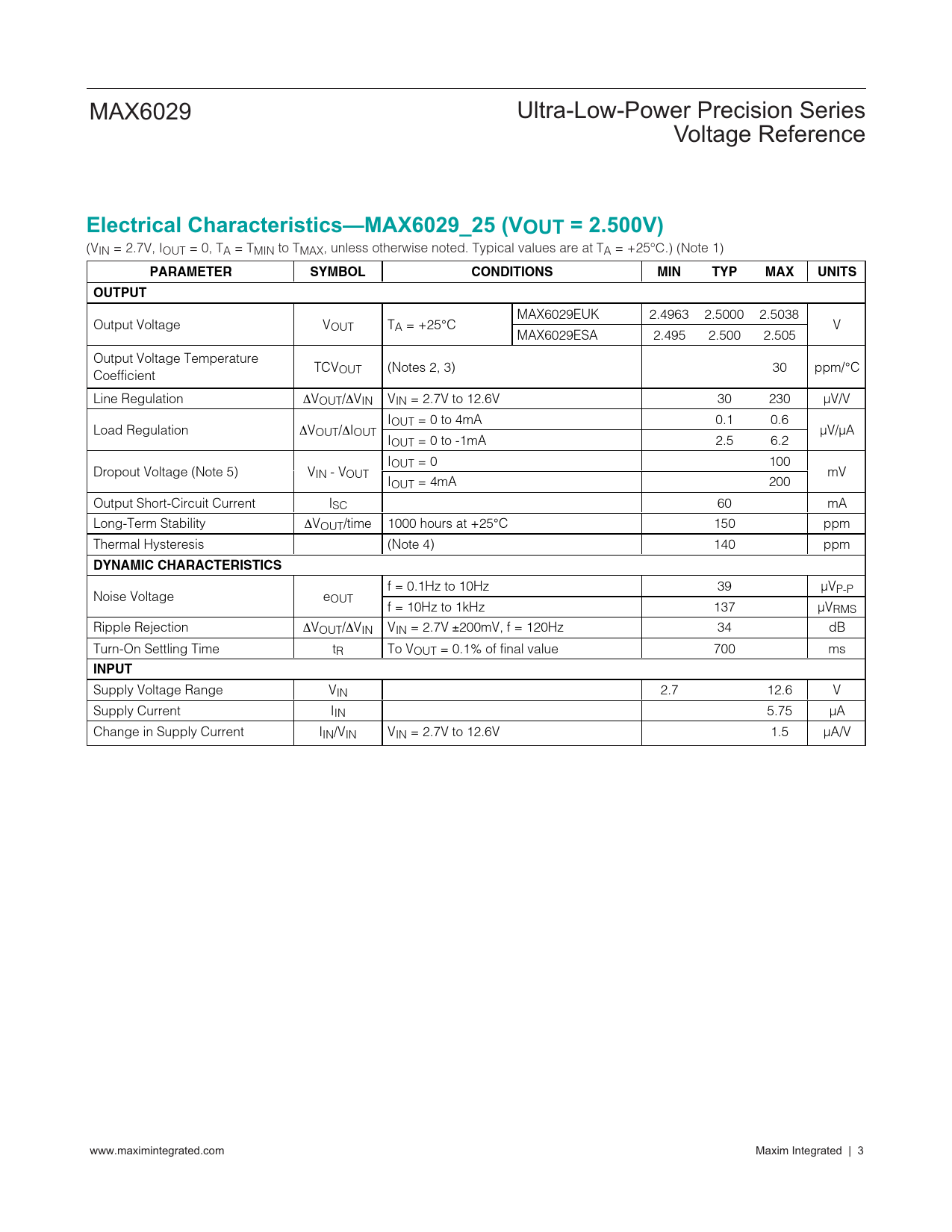 MAX6029EUK 2.4963 2.5000 2.5038 Output Voltage VOUT TA = +25°C V MAX6029ESA 2.495 2.500 2.505 Output Voltage Temperature TCV Coefficient OUT (Notes 2, 3) 30 ppm/°C Line Regulation ΔVOUT/ΔVIN VIN = 2.7V to 12.6V 30 230 µV/V IOUT = 0 to 4mA 0.1 0.6 Load Regulation ΔVOUT/ΔIOUT µV/µA IOUT = 0 to -1mA 2.5 6.2 IOUT = 0 100 Dropout Voltage (Note 5) VIN - VOUT mV IOUT = 4mA 200 Output Short-Circuit Current ISC 60 mA Long-Term Stability ΔVOUT/time 1000 hours at +25°C 150 ppm Thermal Hysteresis (Note 4) 140 ppm