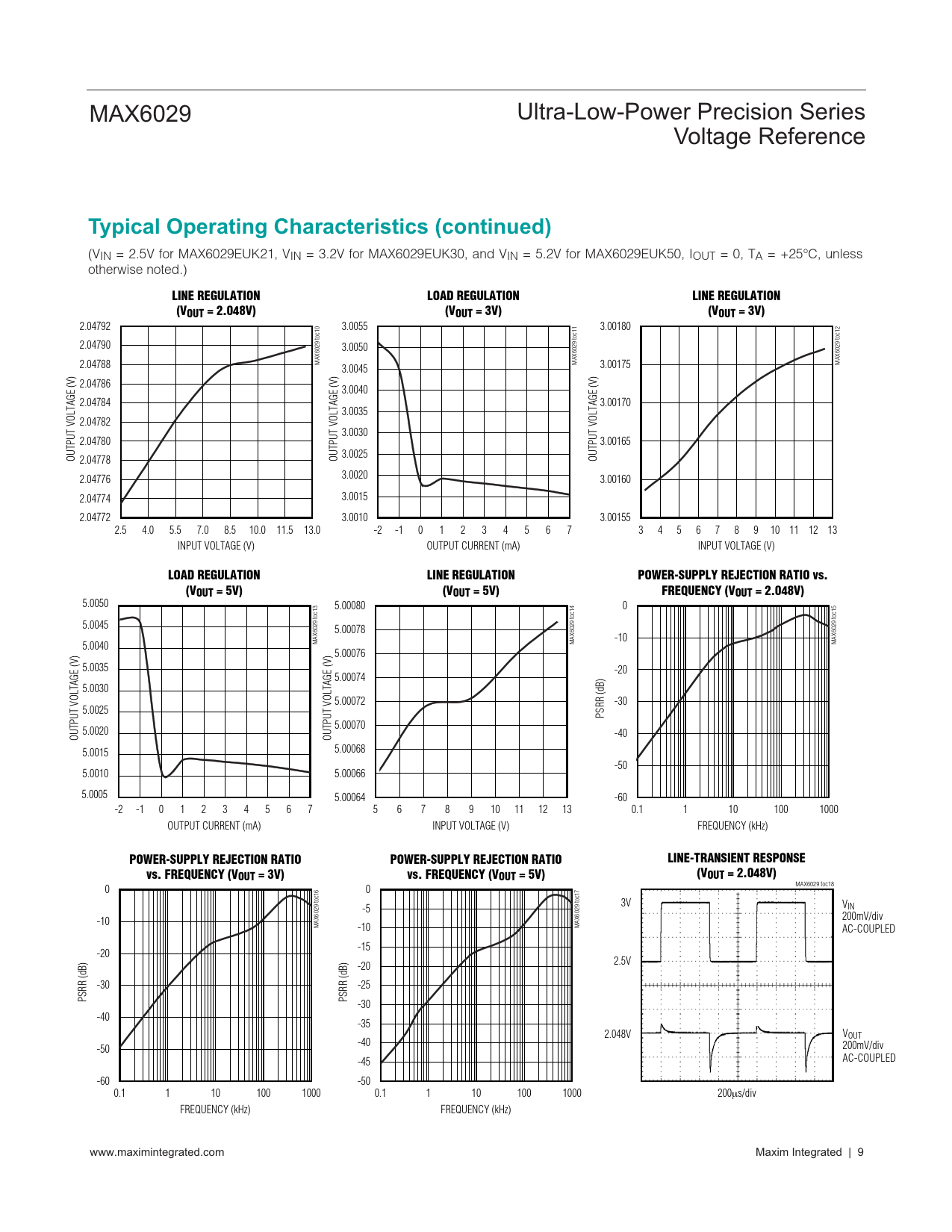 POWER-SUPPLY REJECTION RATIO POWER-SUPPLY REJECTION RATIO LINE-TRANSIENT RESPONSE vs. FREQUENCY (VOUT = 3V) vs. FREQUENCY (VOUT = 5V) (VOUT = 2.048V)