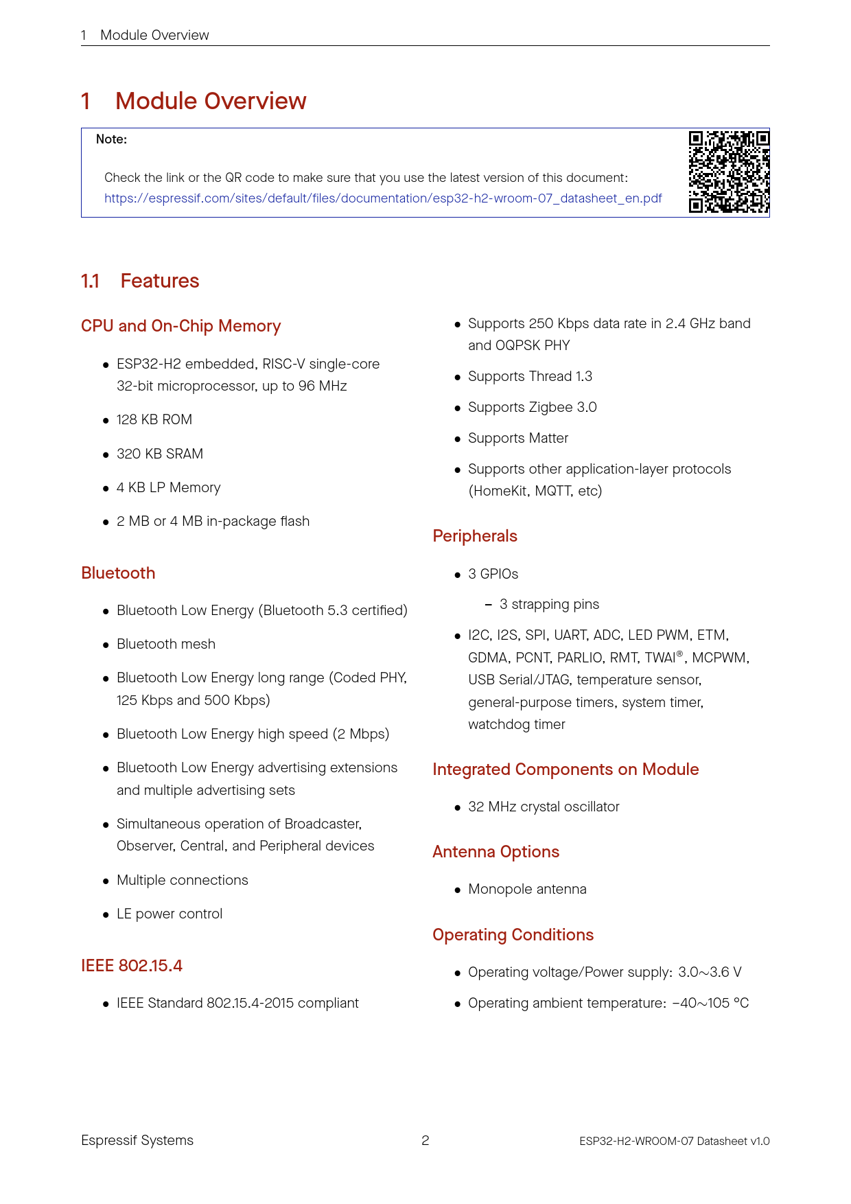 1 Module Overview 1 Module Overview Note: Check the link or the QR code to make sure that you use the latest version of this document: https://espressif.com/sites/default/files/documentation/esp32-h2-wroom-07_datasheet_en.pdf 1.1 Features CPU and On-Chip Memory • Supports 250 Kbps data rate in 2.4 GHz band and OQPSK PHY • ESP32-H2 embedded, RISC-V single-core • Supports Thread 1.3 32-bit microprocessor, up to 96 MHz • Supports Zigbee 3.0 • 128 KB ROM • Supports Matter • 320 KB SRAM • Supports other application-layer protocols • 4 KB LP Memory (HomeKit, MQTT, etc) • 2 MB or 4 MB in-package flash Peripherals Bluetooth • 3 GPIOs • Bluetooth Low Energy (Bluetooth 5.3 certified) – 3 strapping pins • • I2C, I2S, SPI, UART, ADC, LED PWM, ETM, Bluetooth mesh GDMA, PCNT, PARLIO, RMT, TWAI®, MCPWM, • Bluetooth Low Energy long range (Coded PHY, USB Serial/JTAG, temperature sensor, 125 Kbps and 500 Kbps) general-purpose timers, system timer, • watchdog timer Bluetooth Low Energy high speed (2 Mbps) • Bluetooth Low Energy advertising extensions Integrated Components on Module and multiple advertising sets • 32 MHz crystal oscillator • Simultaneous operation of Broadcaster, Observer, Central, and Peripheral devices Antenna Options • Multiple connections • Monopole antenna • LE power control Operating Conditions IEEE 802.15.4 • Operating voltage/Power supply: 3.0∼3.6 V • IEEE Standard 802.15.4-2015 compliant • Operating ambient temperature: –40∼105 °C Espressif Systems 2 ESP32-H2-WROOM-07 Datasheet v1.0 Document Outline 1 Module Overview 1.1 Features 1.2 Series Comparison 1.3 Applications 2 Block Diagram 3 Pin Definitions 3.1 Pin Layout 3.2 Pin Description 4 Boot Configurations 4.1 Chip Boot Mode Control 4.2 ROM Messages Printing Control 4.3 JTAG Signal Source Control 5 Peripherals 5.1 Peripheral Overview 5.2 Peripheral Description 5.2.1 Connectivity Interfaces 5.2.1.1 UART Controller 5.2.1.2 SPI Controller 5.2.1.3 I2C Controller 5.2.1.4 I2S Controller 5.2.1.5 Pulse Count Controller 5.2.1.6 USB Serial/JTAG Controller 5.2.1.7 Two-wire Automotive Interface 5.2.1.8 LED PWM Controller 5.2.1.9 Motor Control PWM 5.2.1.10 Remote Control Peripheral 5.2.1.11 Parallel IO Controller 5.2.2 Analog Signal Processing 5.2.2.1 SAR ADC 5.2.2.2 Temperature Sensor 5.2.2.3 Analog PAD Voltage Comparator 6 Electrical Characteristics 6.1 Absolute Maximum Ratings 6.2 Recommended Operating Conditions 6.3 DC Characteristics (3.3 V, 25 °C) 6.4 Current Consumption Characteristics 6.4.1 Current Consumption in Active Mode 6.4.2 Current Consumption in Other Modes 7 RF Characteristics 7.1 Bluetooth LE Radio 7.1.1 Bluetooth LE RF Transmitter (TX) Characteristics 7.1.2 Bluetooth LE RF Receiver (RX) Characteristics 7.2 802.15.4 Radio 7.2.1 802.15.4 RF Transmitter (TX) Characteristics 7.2.2 802.15.4 RF Receiver (RX) Characteristics 8 Module Schematics 9 Peripheral Schematics 10 Module Dimensions 11 PCB Layout Recommendations 11.1 PCB Land Pattern 11.2 Module Placement for PCB Design 12 Product Handling 12.1 Storage Conditions 12.2 Electrostatic Discharge (ESD) 12.3 Soldering Profile 12.3.1 Wave Profile 12.4 Ultrasonic Vibration Related Documentation and Resources Revision History