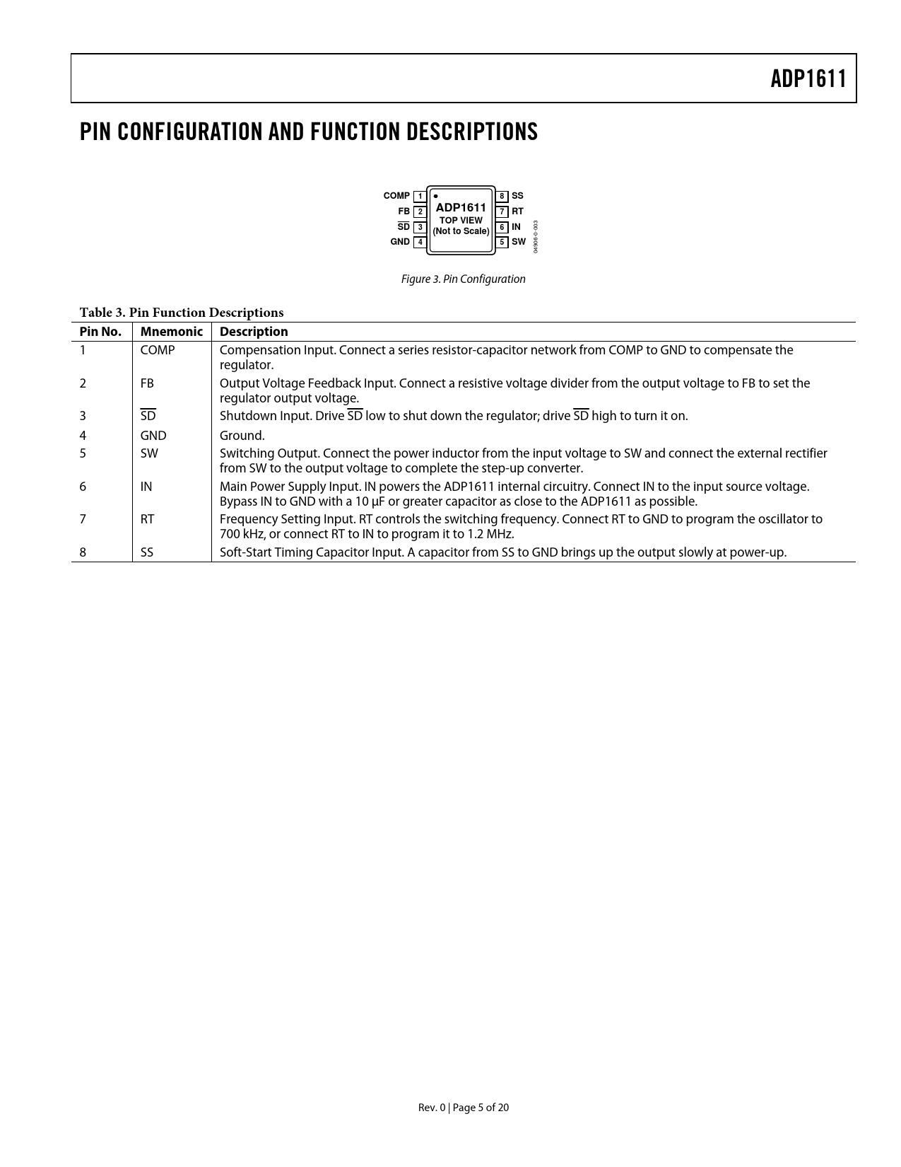 ADP1611 PIN CONFIGURATION AND FUNCTION DESCRIPTIONS COMP 1 8 SS FB ADP1611 2 7 RT TOP VIEW SD 3 6 IN (Not to Scale) GND 4 5 SW