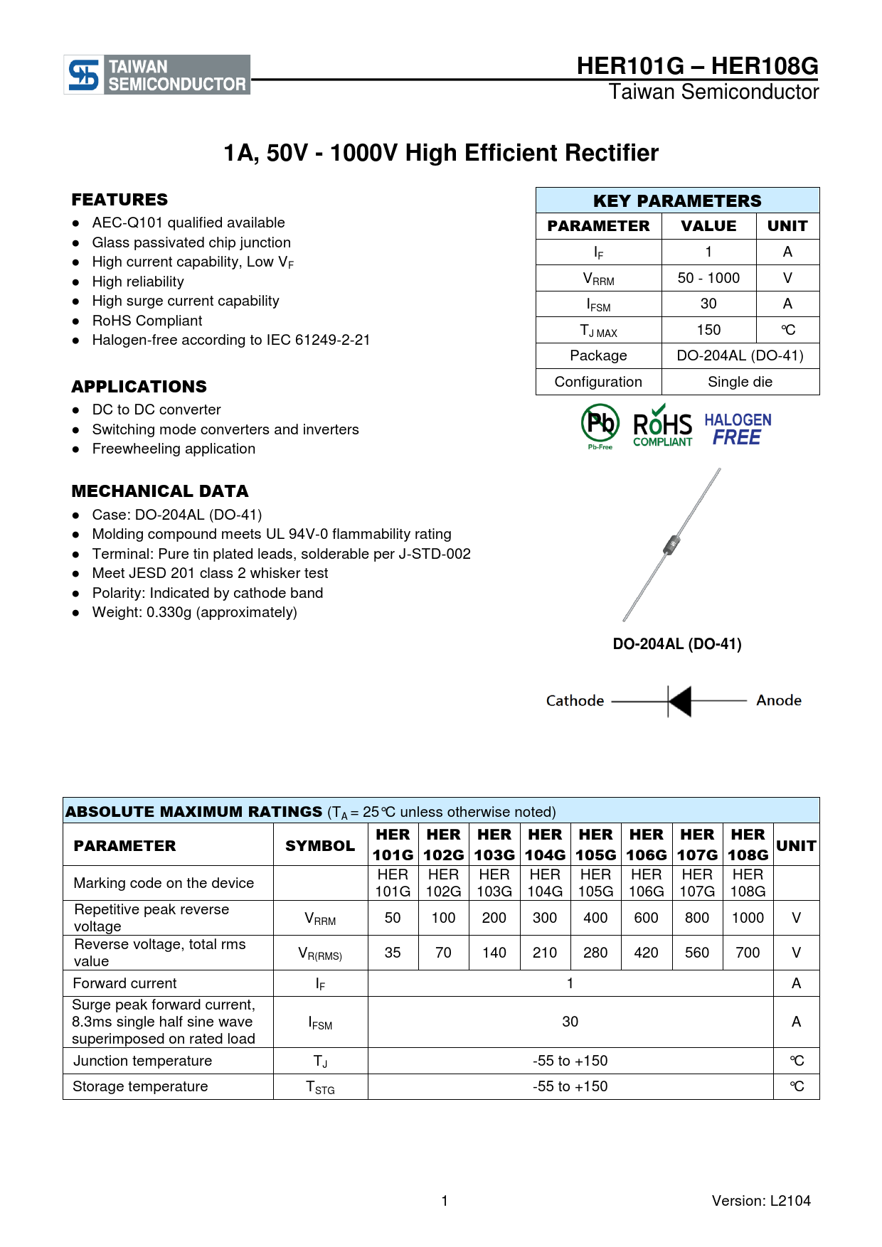HER101G – HER108G Taiwan Semiconductor 1A, 50V - 1000V High Efficient RectifierFEATURESKEY PARAMETERS ● AEC-Q101 qualified available PARAMETERVALUEUNIT ● Glass passivated chip junction I ● High current capability, Low V F 1 A F ● High reliability VRRM 50 - 1000 V ● High surge current capability IFSM 30 A ● RoHS Compliant T ● J MAX 150 °C Halogen-free according to IEC 61249-2-21 Package DO-204AL (DO-41) APPLICATIONS Configuration Single die ● DC to DC converter ● Switching mode converters and inverters ● Freewheeling application MECHANICAL DATA ● Case: DO-204AL (DO-41) ● Molding compound meets UL 94V-0 flammability rating ● Terminal: Pure tin plated leads, solderable per J-STD-002 ● Meet JESD 201 class 2 whisker test ● Polarity: Indicated by cathode band ● Weight: 0.330g (approximately) DO-204AL (DO-41)ABSOLUTE MAXIMUM RATINGS (TA = 25°C unless otherwise noted) HER HER HER HER HER HER HER HERPARAMETERSYMBOLUNIT101G 102G 103G 104G 105G 106G 107G 108G HER HER HER HER HER HER HER HER Marking code on the device 101G 102G 103G 104G 105G 106G 107G 108G Repetitive peak reverse V voltage RRM 50 100 200 300 400 600 800 1000 V Reverse voltage, total rms V value R(RMS) 35 70 140 210 280 420 560 700 V Forward current IF 1 A Surge peak forward current, 8.3ms single half sine wave IFSM 30 A superimposed on rated load Junction temperature TJ -55 to +150 °C Storage temperature TSTG -55 to +150 °C 1 Version: L2104