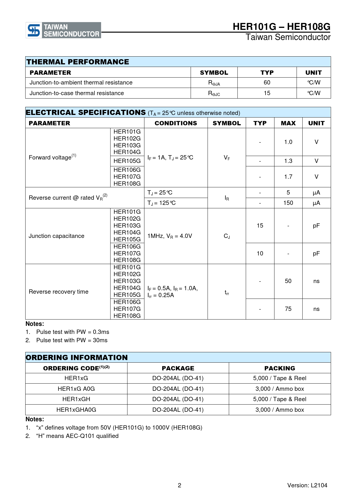 1. “x” defines voltage from 50V (HER101G) to 1000V (HER108G) 2. “H” means AEC-Q101 qualified 2 Version: L2104