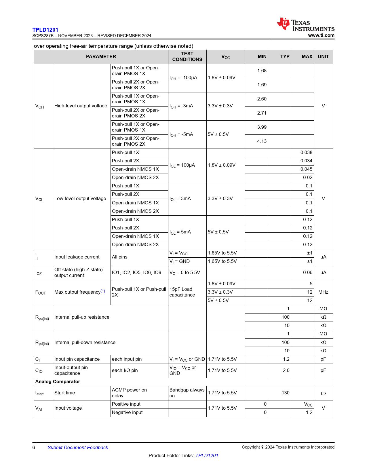 TPLD1201. www.ti.com. TEST. PARAMETER. CONDITIONS. MIN. TYP. MAX UNIT. Analog Comparator