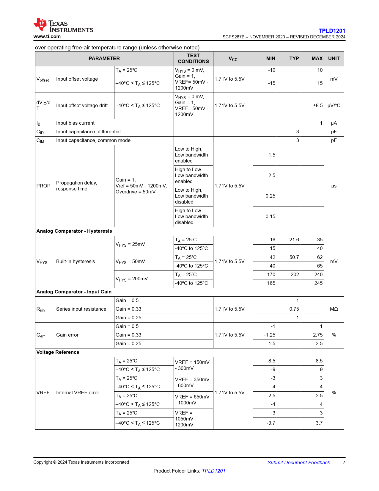 TPLD1201. www.ti.com. TEST. PARAMETER. CONDITIONS. MIN. TYP. MAX UNIT. Analog Comparator - Hysteresis. Analog Comparator - Input Gain