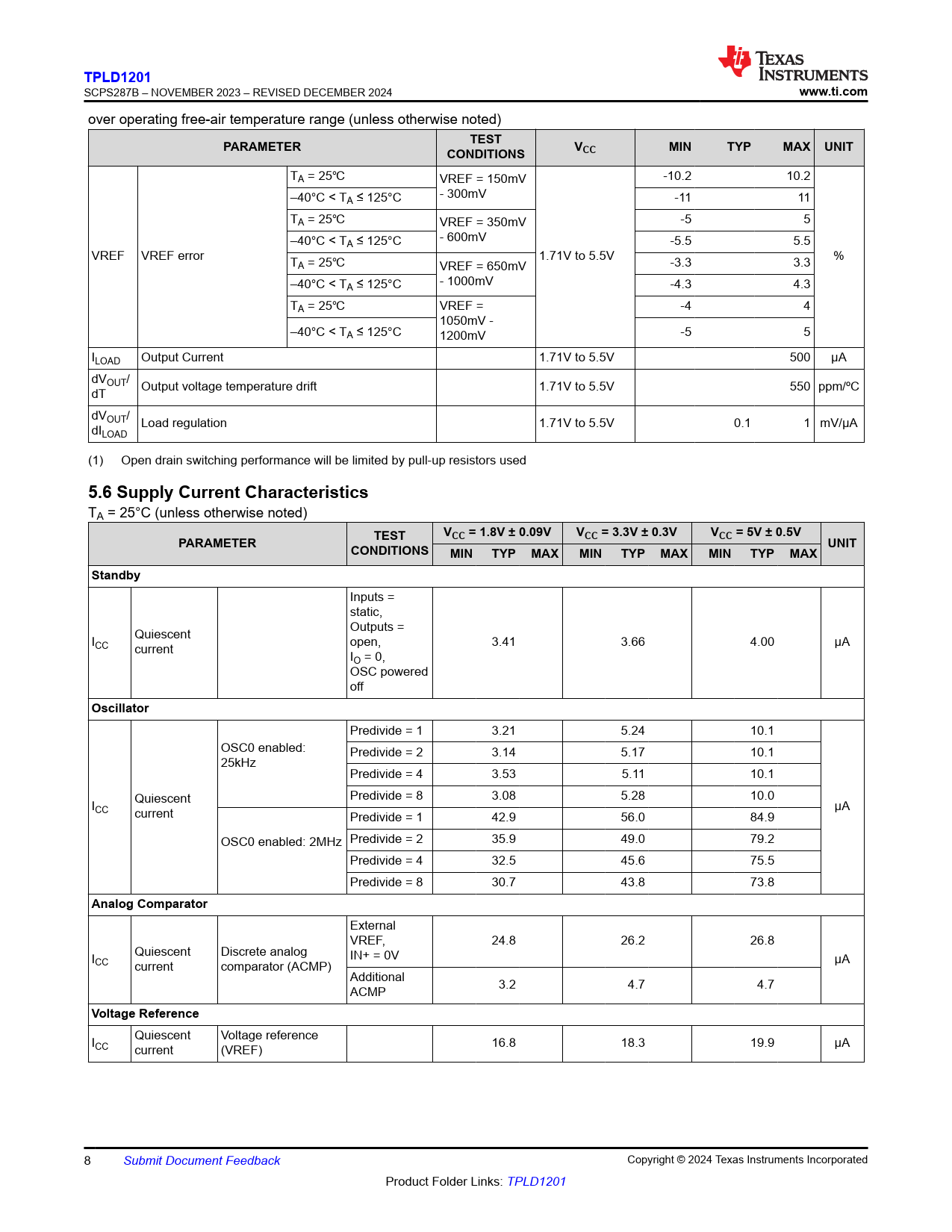 Quiescent Voltage reference ICC 16.8 18.3 19.9 µA current (VREF) 8 Submit Document Feedback Copyright © 2024 Texas Instruments Incorporated Product Folder Links: TPLD1201 Document Outline 1 Features 2 Applications 3 Description Table of Contents 4 Pin Configuration and Functions 5 Specifications 5.1 Absolute Maximum Ratings 5.2 ESD Ratings 5.3 Recommended Operating Conditions 5.4 Thermal Information 5.5 Electrical Characteristics 5.6 Supply Current Characteristics 5.7 Switching Characteristics 5.8 Typical Characteristics 6 Parameter Measurement Information 7 Detailed Description 7.1 Overview 7.2 Functional Block Diagram 7.3 Feature Description 7.3.1 I/O Pins 7.3.2 Connection Mux 7.3.3 Configurable Use Logic Blocks 7.3.3.1 2-Bit LUT Macro-Cell 7.3.3.2 3-Bit LUT Macro-Cell 7.3.3.3 2-Bit LUT or D Flip-Flop or Latch Macro-Cell 7.3.3.4 3-Bit LUT or D Flip-Flop or Latch with Set or Reset Macro-Cell 7.3.3.5 3-Bit LUT or Pipe Delay Macro-cell 7.3.3.6 4-Bit LUT or 8-Bit Counter or Delay Macro-Cell 7.3.4 8-Bit Counters and Delay Generators (CNT/DLY) 7.3.4.1 Delay Mode 7.3.4.2 Edge Detector Mode 7.3.4.3 Reset Counter Mode 7.3.5 Programmable Deglitch Filter or Edge Detector Macro-cell 7.3.6 Selectable Frequency Oscillator 7.3.7 Analog Comparators (ACMP) 7.3.8 Voltage Reference (VREF) 7.4 Device Functional Modes 7.4.1 Power-On Reset 8 Application and Implementation 8.1 Application Information 8.2 Typical Application 8.2.1 Design Requirements 8.2.1.1 Power Considerations 8.2.1.2 Input Considerations 8.2.1.3 Output Considerations 8.2.2 Detailed Design Procedure 8.2.3 Application Curves 8.3 Power Supply Recommendations 8.4 Layout 8.4.1 Layout Guidelines 8.4.2 Layout Example 9 Device and Documentation Support 9.1 Receiving Notification of Documentation Updates 9.2 Support Resources 9.3 Trademarks 9.4 Electrostatic Discharge Caution 9.5 Glossary 10 Revision History 11 Mechanical, Packaging, and Orderable Information 11.1 Packaging Option Addendum 11.2 Tape and Reel Information 11.3 Mechanical Data