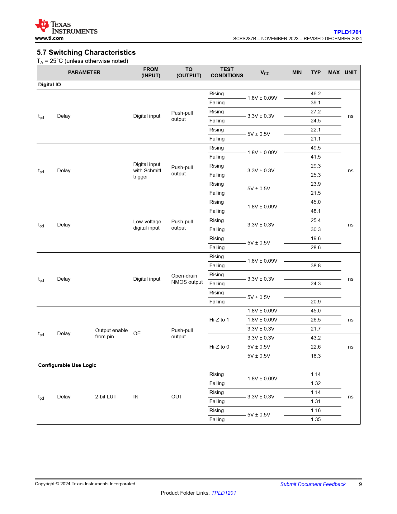 TPLD1201. www.ti.com. 5.7 Switching Characteristics. FROM. TEST. PARAMETER. (INPUT). (OUTPUT). CONDITIONS. MIN. TYP. MAX UNIT. Digital IO
