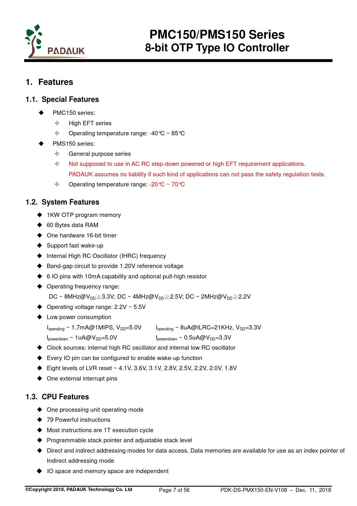 | 页数 / 页 | 56 / 7 — PMC150/PMS150 Series. 8-bit OTP Type IO Controller. 1. Features. 1.1. … |