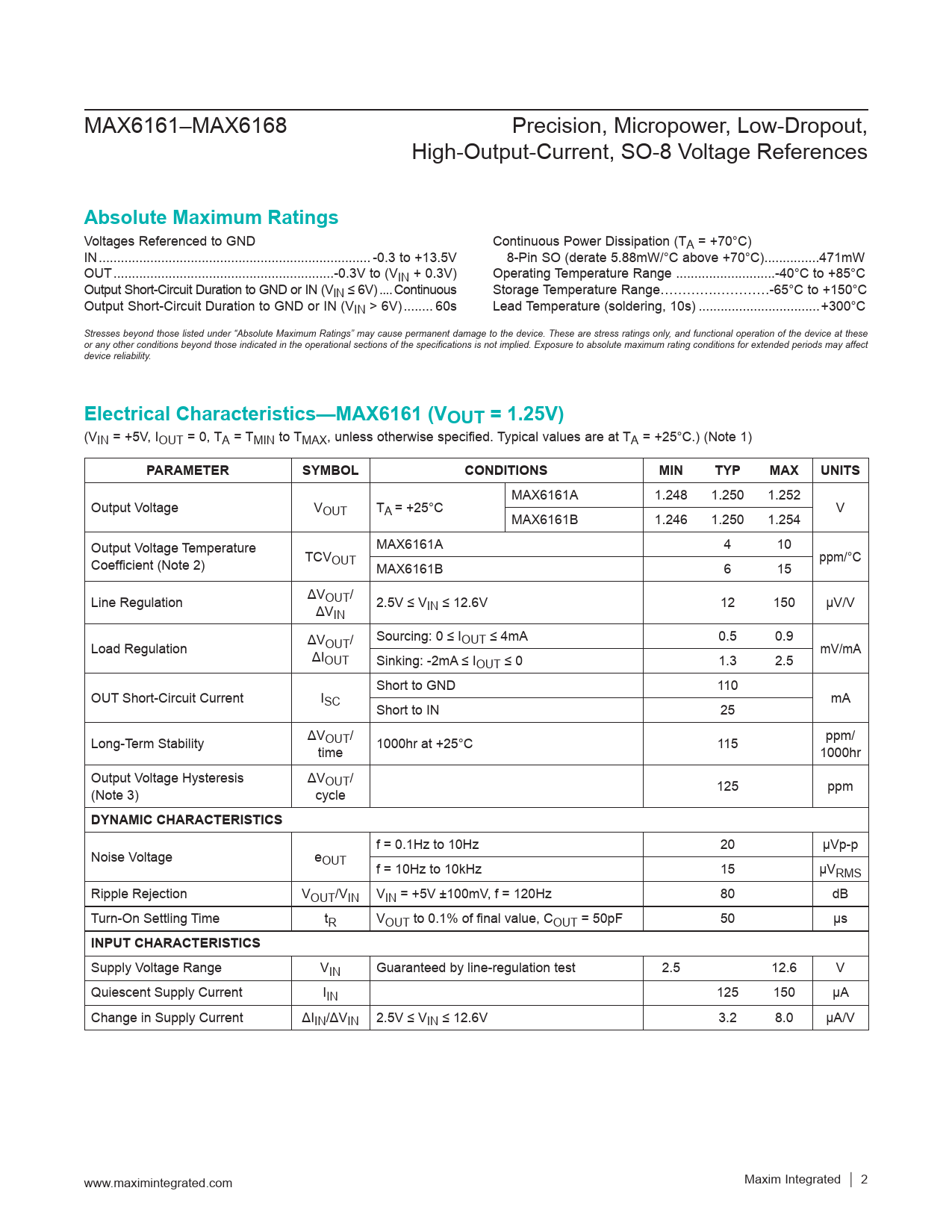 MAX6161–MAX6168 Precision, Micropower, Low-Dropout, High-Output-Current, SO-8 Voltage References Absolute Maximum Ratings Voltages Referenced to GND Continuous Power Dissipation (TA = +70°C) IN .. -0.3 to +13.5V 8-Pin SO (derate 5.88mW/°C above +70°C)...471mW OUT ..-0.3V to (VIN + 0.3V) Operating Temperature Range ...-40°C to +85°C Output Short-Circuit Duration to GND or IN (VIN ≤ 6V) ..Continuous Storage Temperature Range………….…………-65°C to +150°C Output Short-Circuit Duration to GND or IN (VIN > 6V) .. 60s Lead Temperature (soldering, 10s) ...+300°C Stresses beyond those listed under “Absolute Maximum Ratings” may cause permanent damage to the device. These are stress ratings only, and functional operation of the device at these or any other conditions beyond those indicated in the operational sections of the specifications is not implied. Exposure to absolute maximum rating conditions for extended periods may affect device reliability. Electrical Characteristics—MAX6161 (VOUT = 1.25V) (VIN = +5V, IOUT = 0, TA = TMIN to TMAX, unless otherwise specified. Typical values are at TA = +25°C.) (Note 1) PARAMETERSYMBOLCONDITIONSMINTYPMAXUNITS MAX6161A 1.248 1.250 1.252 Output Voltage VOUT TA = +25°C V MAX6161B 1.246 1.250 1.254 Output Voltage Temperature MAX6161A 4 10 Coefficient (Note 2) TCVOUT ppm/°C MAX6161B 6 15 Line Regulation ΔVOUT/ ΔV 2.5V ≤ VIN ≤ 12.6V 12 150 µV/V IN Sourcing: 0 ≤ I Load Regulation ΔVOUT/ OUT ≤ 4mA 0.5 0.9 ΔI mV/mA OUT Sinking: -2mA ≤ IOUT ≤ 0 1.3 2.5 Short to GND 110 OUT Short-Circuit Current ISC mA Short to IN 25 Long-Term Stability ΔVOUT/ time 1000hr at +25°C 115 ppm/ 1000hr Output Voltage Hysteresis ΔVOUT/ (Note 3) cycle 125 ppm DYNAMIC CHARACTERISTICS f = 0.1Hz to 10Hz 20 µVp-p Noise Voltage eOUT f = 10Hz to 10kHz 15 µVRMS Ripple Rejection VOUT/VIN VIN = +5V ±100mV, f = 120Hz 80 dB Turn-On Settling Time tR VOUT to 0.1% of final value, COUT = 50pF 50 µs INPUT CHARACTERISTICS Supply Voltage Range VIN Guaranteed by line-regulation test 2.5 12.6 V Quiescent Supply Current IIN 125 150 µA Change in Supply Current ΔIIN/ΔVIN 2.5V ≤ VIN ≤ 12.6V 3.2 8.0 µA/V www.maximintegrated.com Maxim Integrated │ 2