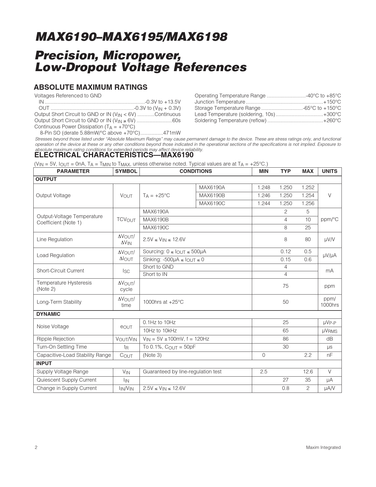 MAX6190–MAX6195/MAX6198Precision, Micropower, Low-Dropout Voltage ReferencesABSOLUTE MAXIMUM RATINGS Voltages Referenced to GND Operating Temperature Range ...-40°C to +85°C IN ..-0.3V to +13.5V Junction Temperature ..+150°C OUT ..-0.3V to (VIN + 0.3V) Storage Temperature Range ...-65°C to +150°C Output Short Circuit to GND or IN (VIN < 6V) ..Continuous Lead Temperature (soldering, 10s) ...+300°C Output Short Circuit to GND or IN (VIN ≥ 6V) ...60s Soldering Temperature (reflow) ...+260°C Continuous Power Dissipation (TA = +70°C) 8-Pin SO (derate 5.88mW/°C above +70°C)..471mW Stresses beyond those listed under “Absolute Maximum Ratings” may cause permanent damage to the device. These are stress ratings only, and functional operation of the device at these or any other conditions beyond those indicated in the operational sections of the specifications is not implied. Exposure to absolute maximum rating conditions for extended periods may affect device reliability. ELECTRICAL CHARACTERISTICS—MAX6190 (VIN = 5V, IOUT = 0nA, TA = TMIN to TMAX, unless otherwise noted. Typical values are at TA = +25°C.) PARAMETERSYMBOLCONDITIONSMINTYPMAXUNITSOUTPUT MAX6190A 1.248 1.250 1.252 Output Voltage VOUT TA = +25°C MAX6190B 1.246 1.250 1.254 V MAX6190C 1.244 1.250 1.256 MAX6190A 2 5 Output-Voltage Temperature TCVOUT MAX6190B 4 10 ppm/°C Coefficient (Note 1) MAX6190C 8 25 ΔVOUT/ Line Regulation 2.5V ≤ VIN ≤ 12.6V 8 80 µV/V ΔVIN ΔV Sourcing: 0 OUT/ ≤ IOUT ≤ 500µA 0.12 0.5 Load Regulation µV/µA ΔIOUT Sinking: -500µA ≤ IOUT ≤ 0 0.15 0.6 Short to GND 4 Short-Circuit Current ISC mA Short to IN 4 Temperature Hysteresis ΔVOUT/ 75 ppm (Note 2) cycle ΔVOUT/ ppm/ Long-Term Stability 1000hrs at +25°C 50 time 1000hrs DYNAMIC 0.1Hz to 10Hz 25 µVP-P Noise Voltage eOUT 10Hz to 10kHz 65 µVRMS Ripple Rejection VOUT/VIN VIN = 5V ±100mV, f = 120Hz 86 dB Turn-On Settling Time tR To 0.1%, COUT = 50pF 30 µs Capacitive-Load Stability Range COUT (Note 3) 0 2.2 nF INPUT Supply Voltage Range VIN Guaranteed by line-regulation test 2.5 12.6 V Quiescent Supply Current IIN 27 35 µA Change in Supply Current IIN/VIN 2.5V ≤ VIN ≤ 12.6V 0.8 2 µA/V 2 Maxim Integrated