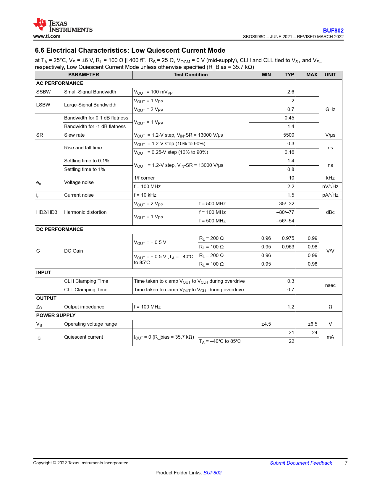 BUF802. www.ti.com. 6.6 Electrical Characteristics: Low Quiescent Current Mode. PARAMETER. Test Condition. MIN. TYP. MAX. UNIT