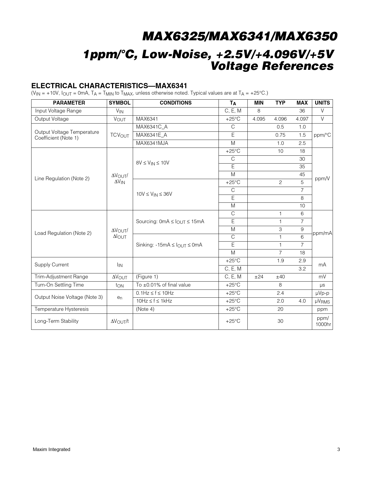 MAX6325/MAX6341/MAX6350 MAX6325/MAX6341/MAX6350 1ppm/°C, Low-Noise, +2.5V/+4.096V/+5VVoltage ReferencesELECTRICAL CHARACTERISTICS—MAX6341 (VIN = +10V, IOUT = 0mA, TA = TMIN to TMAX, unless otherwise noted. Typical values are at TA = +25°C.) PARAMETERSYMBOLCONDITIONSTAMINTYPMAXUNITS Input Voltage Range VIN C, E, M 8 36 V Output Voltage VOUT MAX6341 +25°C 4.095 4.096 4.097 V MAX6341C_A C 0.5 1.0 Output Voltage Temperature TCV MAX6341E_A Coefficient (Note 1) OUT E 0.75 1.5 ppm/°C MAX6341MJA M 1.0 2.5 +25°C 10 18 C 30 8V ≤ VIN ≤ 10V E 35 ∆V M 45 Line Regulation (Note 2) OUT/ ∆ ppm/V VIN +25°C 2 5 C 7 10V ≤ VIN ≤ 36V E 8 M 10 C 1 6 Sourcing: 0mA ≤ IOUT ≤ 15mA E 1 7 M 3 9 ∆VOUT/ Load Regulation (Note 2) ∆ ppm/mA IOUT C 1 6 Sinking: -15mA ≤ IOUT ≤ 0mA E 1 7 M 7 18 +25°C 1.9 2.9 Supply Current IIN mA C, E, M 3.2 Trim-Adjustment Range ∆VOUT (Figure 1) C, E, M ±24 ±40 mV Turn-On Settling Time tON To ±0.01% of final value +25°C 8 µs 0.1Hz ≤ f ≤ 10Hz +25°C 2.4 µVp-p Output Noise Voltage (Note 3) en 10Hz ≤ f ≤ 1kHz +25°C 2.0 4.0 µVRMS Temperature Hysteresis (Note 4) +25°C 20 ppm ppm/ Long-Term Stability ∆VOUT/t +25°C 30 1000hr Maxim Integrated 3