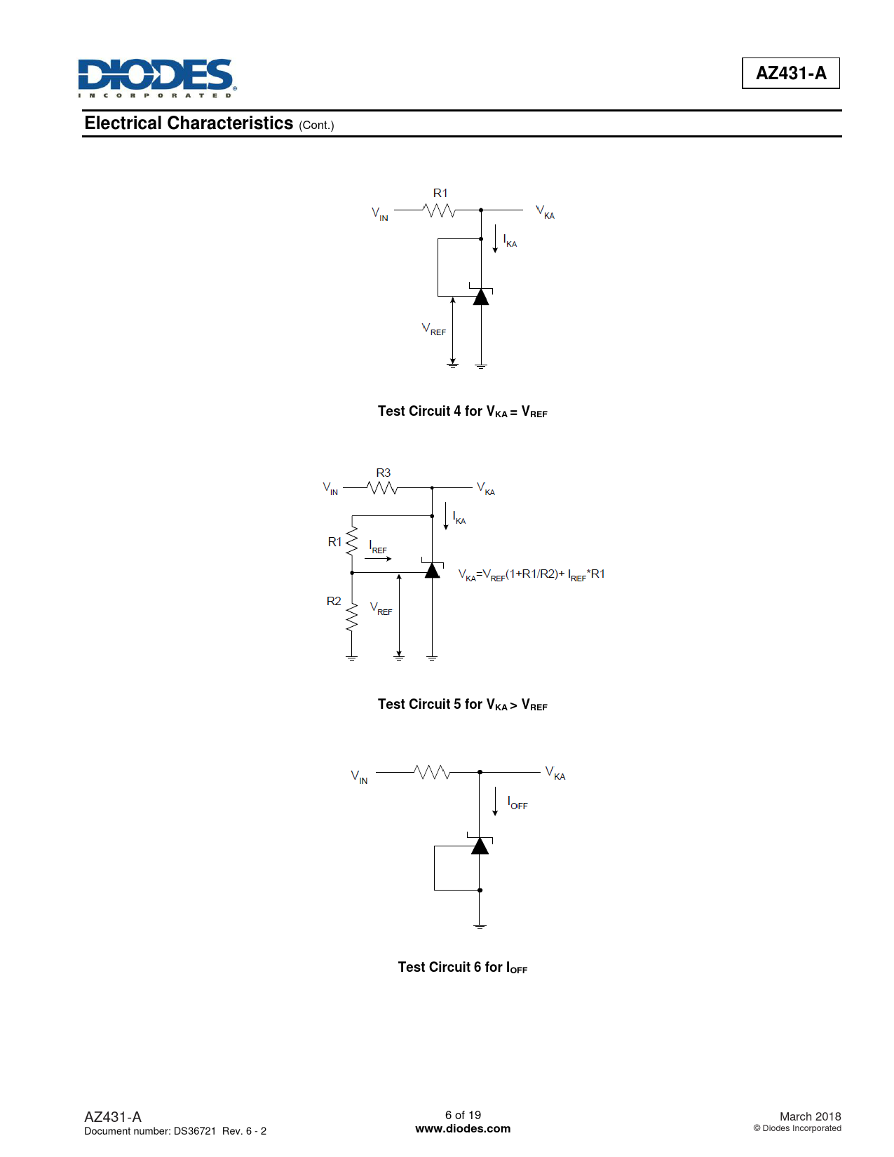 AZ431-A. Electrical Characteristics. Test Circuit 4 for VKA = VREF. Test Circuit 5 for VKA > VREF. Test Circuit 6 for IOFF