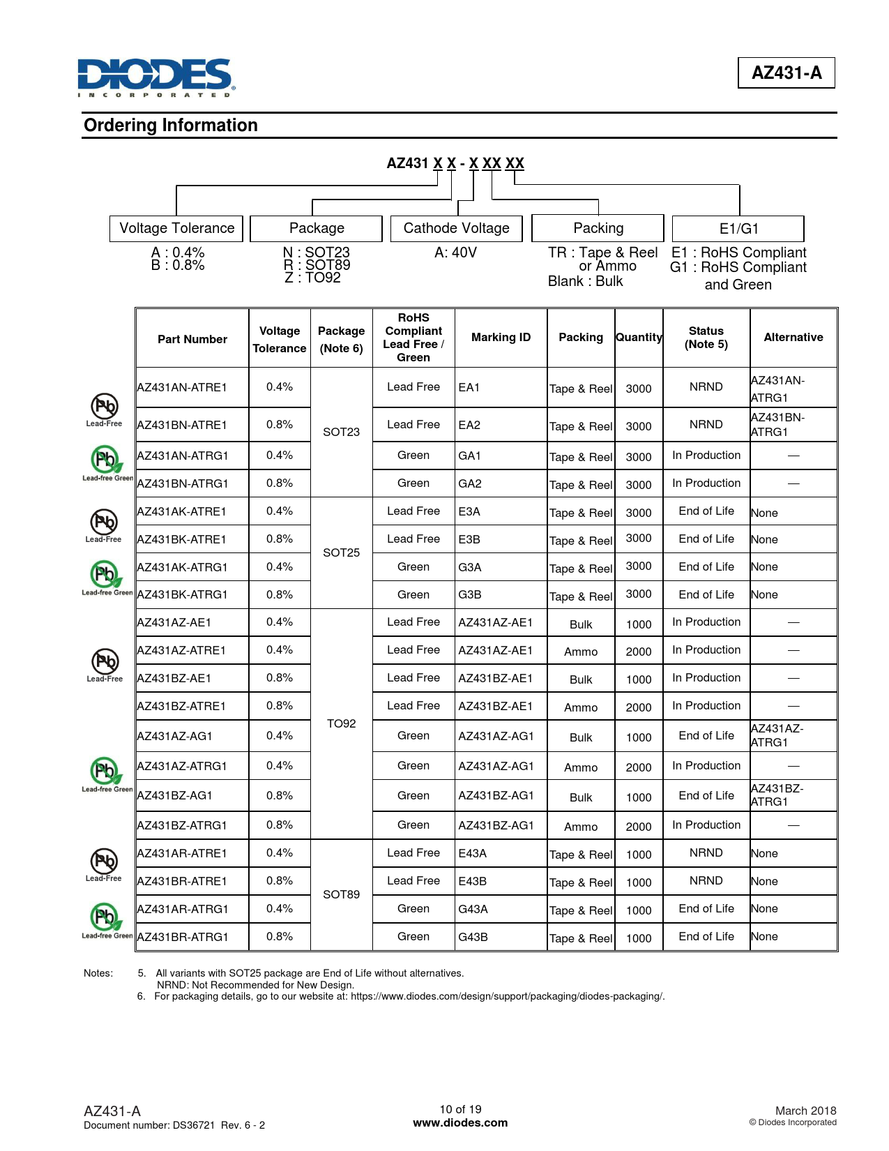 AZ431BR-ATRE1 0.8% Lead Free E43B Tape & Reel 1000 NRND None SOT89 AZ431AR-ATRG1 0.4% Green G43A Tape & Reel 1000 End of Life None AZ431BR-ATRG1 0.8% Green G43B Tape & Reel 1000 End of Life None Notes: 5. All variants with SOT25 package are End of Life without alternatives. NRND: Not Recommended for New Design. 6. For packaging details, go to our website at: https://www.diodes.com/design/support/packaging/diodes-packaging/. AZ431-A 10 of 19 March 2018 Document number: DS36721 Rev. 6 - 2
