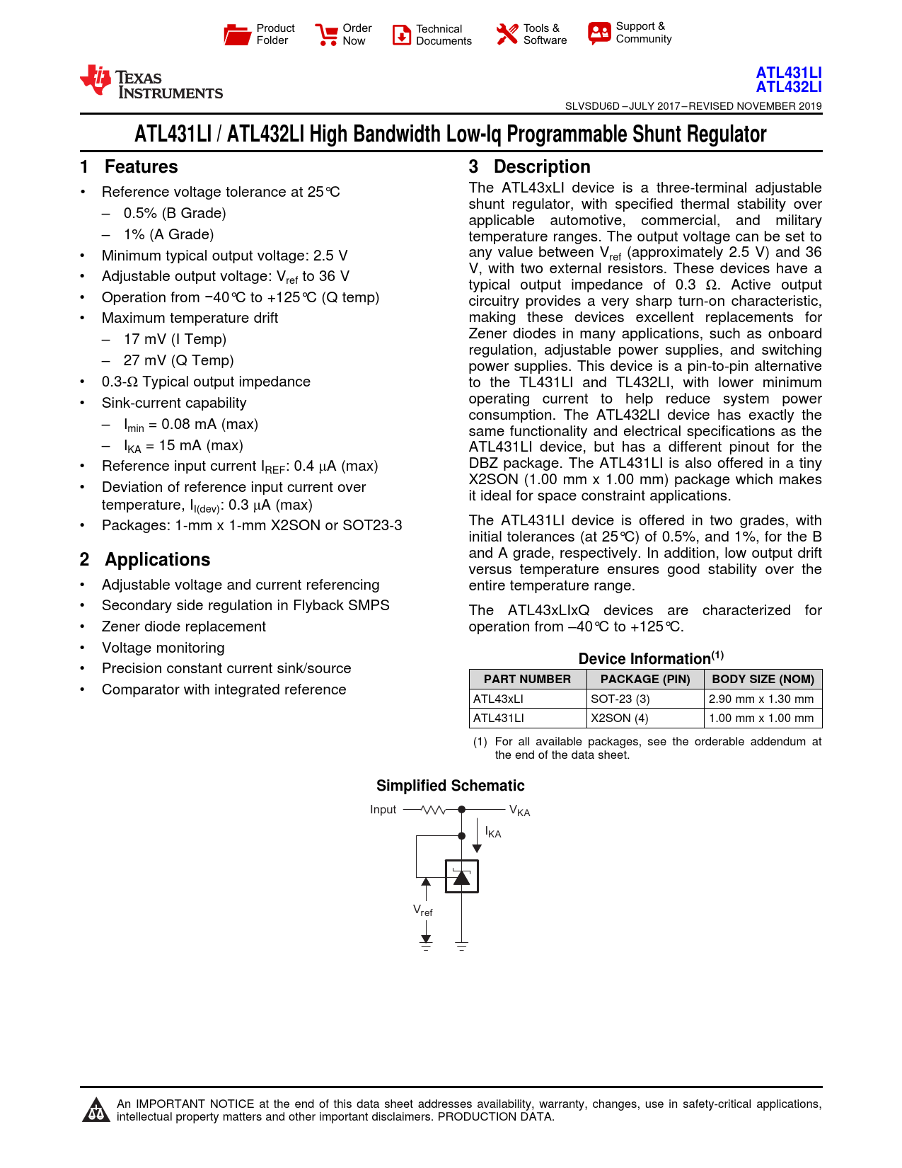 ATL431LI. ATL432LI. ATL431LI / ATL432LI High Bandwidth Low-Iq Programmable Shunt Regulator. 1 Features. 3 Description