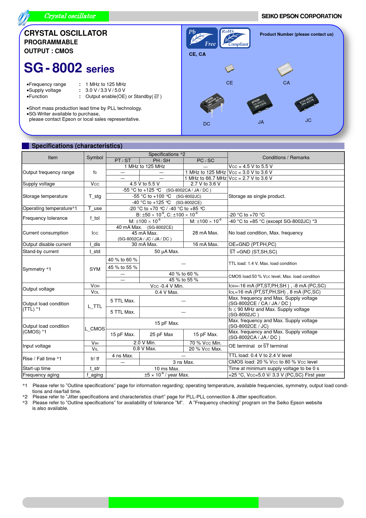 CRYSTAL OSCILLATOR. Product Number (please contact us). PROGRAMMABLE. OUTPUT : CMOS. CE, CA. SG - 8002 series