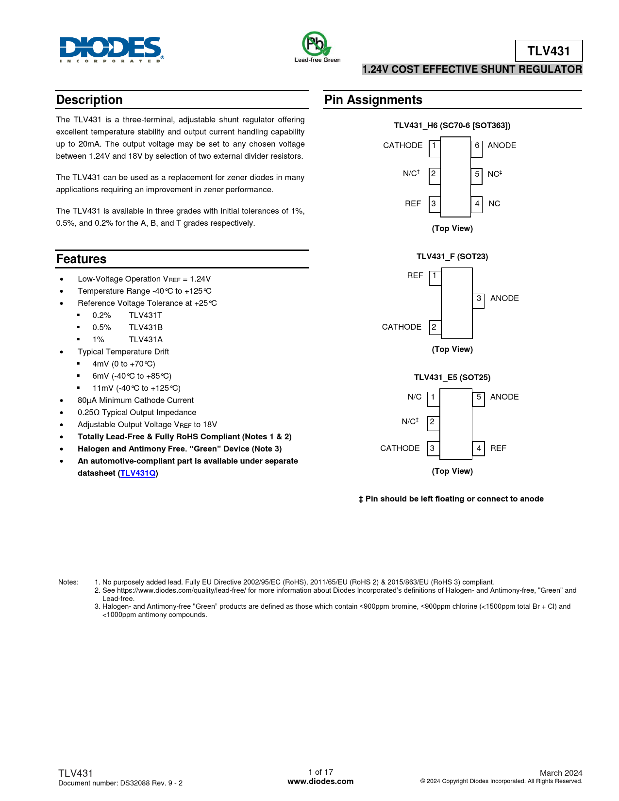 Notes: 1. No purposely added lead. Fully EU Directive 2002/95/EC (RoHS), 2011/65/EU (RoHS 2) & 2015/863/EU (RoHS 3) compliant. 2. See https://www.diodes.com/quality/lead-free/ for more information about Diodes Incorporated’s definitions of Halogen- and Antimony-free, "Green" and Lead-free. 3. Halogen- and Antimony-free "Green” products are defined as those which contain <900ppm bromine, <900ppm chlorine (<1500ppm total Br + Cl) and <1000ppm antimony compounds. TLV431 1 of 17 March 2024 Document number: DS32088 Rev. 9 - 2