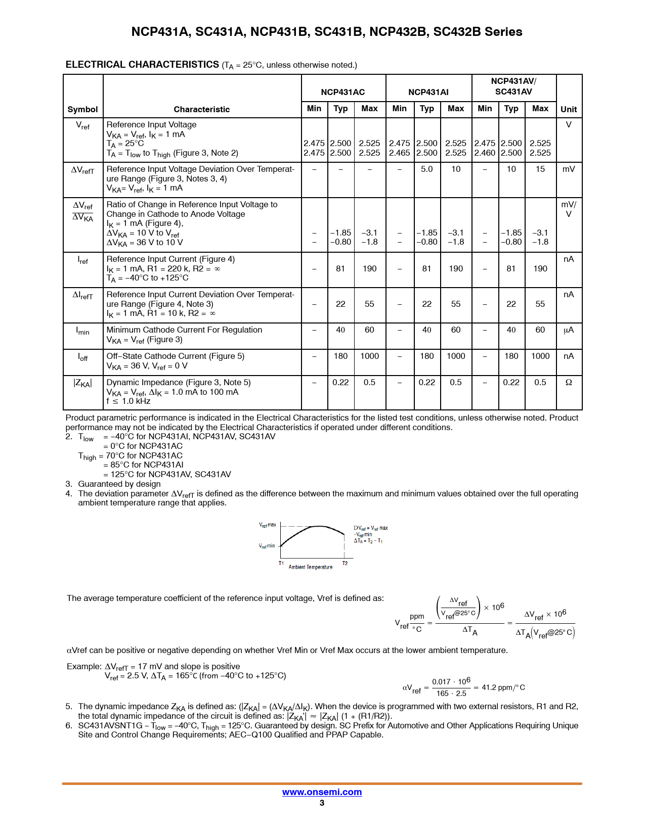 NCP431A, SC431A, NCP431B, SC431B, NCP432B, SC432B Series. ELECTRICAL CHARACTERISTICS. NCP431AV/. NCP431AC. NCP431AI. SC431AV