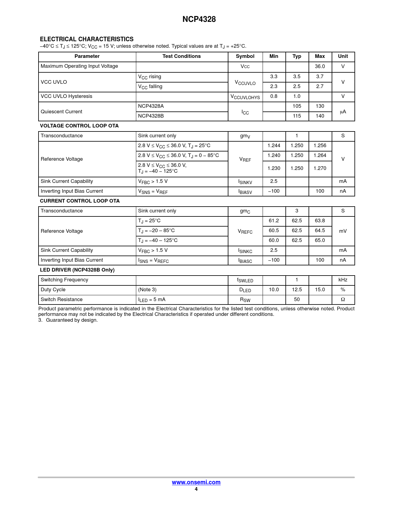 link to page 4 NCP4328ELECTRICAL CHARACTERISTICS −40°C ≤ TJ ≤ 125°C; VCC = 15 V; unless otherwise noted. Typical values are at TJ = +25°C. ParameterTest ConditionsSymbolMinTypMaxUnit Maximum Operating Input Voltage VCC 36.0 V VCC rising 3.3 3.5 3.7 VCC UVLO VCCUVLO V VCC falling 2.3 2.5 2.7 VCC UVLO Hysteresis VCCUVLOHYS 0.8 1.0 V NCP4328A 105 130 Quiescent Current ICC mA NCP4328B 115 140 VOLTAGE CONTROL LOOP OTA Transconductance Sink current only gmV 1 S 2.8 V ≤ VCC ≤ 36.0 V, TJ = 25°C 1.244 1.250 1.256 2.8 V ≤ V Reference Voltage CC ≤ 36.0 V, TJ = 0 − 85°C 1.240 1.250 1.264 VREF V 2.8 V ≤ VCC ≤ 36.0 V, 1.230 1.250 1.270 TJ = −40 − 125°C Sink Current Capability VFBC > 1.5 V ISINKV 2.5 mA Inverting Input Bias Current VSNS = VREF IBIASV −100 100 nA CURRENT CONTROL LOOP OTA Transconductance Sink current only gmC 3 S TJ = 25°C 61.2 62.5 63.8 Reference Voltage TJ = −20 – 85°C VREFC 60.5 62.5 64.5 mV TJ = −40 – 125°C 60.0 62.5 65.0 Sink Current Capability VFBC > 1.5 V ISINKC 2.5 mA Inverting Input Bias Current ISNS = VREFC IBIASC −100 100 nA LED DRIVER (NCP4328B Only) Switching Frequency fSWLED 1 kHz Duty Cycle (Note 3) DLED 10.0 12.5 15.0 % Switch Resistance ILED = 5 mA RSW 50 W Product parametric performance is indicated in the Electrical Characteristics for the listed test conditions, unless otherwise noted. Product performance may not be indicated by the Electrical Characteristics if operated under different conditions. 3. Guaranteed by design. www.onsemi.com4