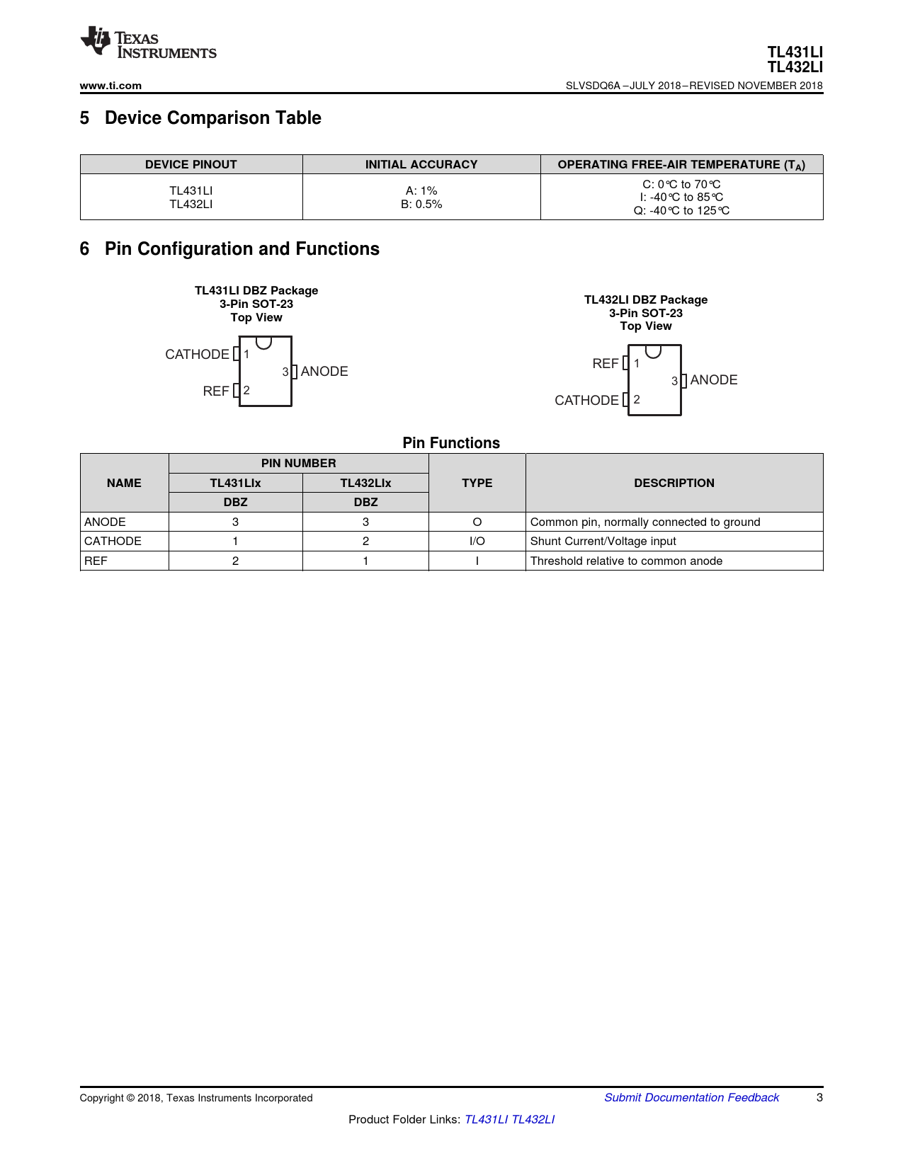 | 页数 / 页 | 35 / 3 — TL431LI. TL432LI. www.ti.com. 5 Device Comparison Table. DEVICE PINOUT. … |