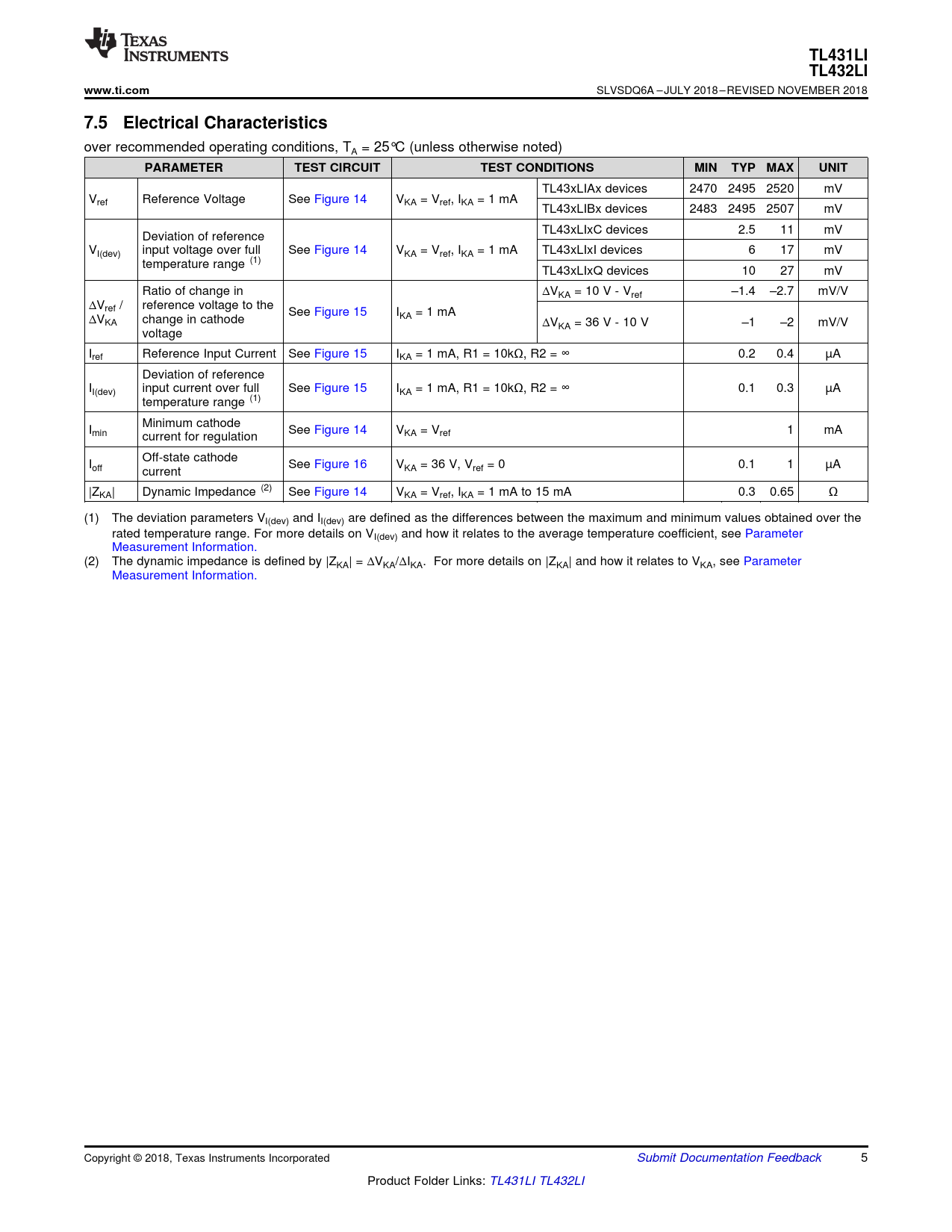 TL431LI. TL432LI. www.ti.com. 7.5 Electrical Characteristics. PARAMETER. TEST CIRCUIT. TEST CONDITIONS. MIN. TYP MAX. UNIT