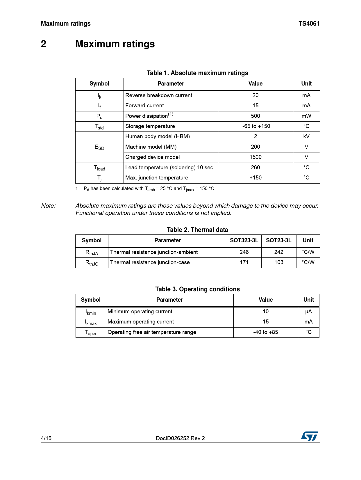 Maximum ratingsTS40612 MaximumratingsTable 1. Absolute maximum ratingsSymbolParameterValueUnit Ik Reverse breakdown current 20 mA If Forward current 15 mA Pd Power dissipation(1) 500 mW Tstd Storage temperature -65 to +150 °C Human body model (HBM) 2 kV ESD Machine model (MM) 200 V Charged device model 1500 V Tlead Lead temperature (soldering) 10 sec 260 °C Tj Max. junction temperature +150 °C 1. Pd has been calculated with Tamb = 25 °C and Tjmax = 150 °C Note: Absolute maximum ratings are those values beyond which damage to the device may occur. Functional operation under these conditions is not implied. Table 2. Thermal dataSymbolParameterSOT323-3LSOT23-3LUnit RthJA Thermal resistance junction-ambient 246 242 °C/W RthJC Thermal resistance junction-case 171 103 °C/W Table 3. Operating conditionsSymbolParameterValueUnit Ikmin Minimum operating current 10 µA Ikmax Maximum operating current 15 mA Toper Operating free air temperature range -40 to +85 °C 4/15 DocID026252 Rev 2 Document Outline 1 Pin configuration Figure 1. Pin configuration SOT23-3L, SOT323-3L (top view) 2 Maximum ratings Table 1. Absolute maximum ratings Table 2. Thermal data Table 3. Operating conditions 3 Electrical characteristics Table 4. Electrical characteristics for TS4061 4 Typical performance characteristics Figure 2. VK change vs temperature (1.225 V version) Figure 3. VK change vs temperature (1.25 V version) Figure 4. IKmin minimum current for regulation Figure 5. IKmin minimum current for regulation vs temperature Figure 6. Output impedance vs frequency Figure 7. Forward characteristics Figure 8. Start-up waveform (no Cload) Figure 9. Start-up waveform (Cload = 100 nF) Figure 10. Low frequency noise 5 Package mechanical data 5.1 SOT23-3L, TS4061 Figure 11. SOT23-3L mechanical drawings Table 5. SOT23-3L mechanical data Figure 12. SOT23-3L recommended footprint 5.2 SOT323-3L, TS4061 Figure 13. SOT323-3L drawings Table 6. SOT323-3L mechanical data Figure 14. SOT323-3L recommended footprint 6 Ordering information Table 7. Order codes 7 Revision history Table 8. Document revision history