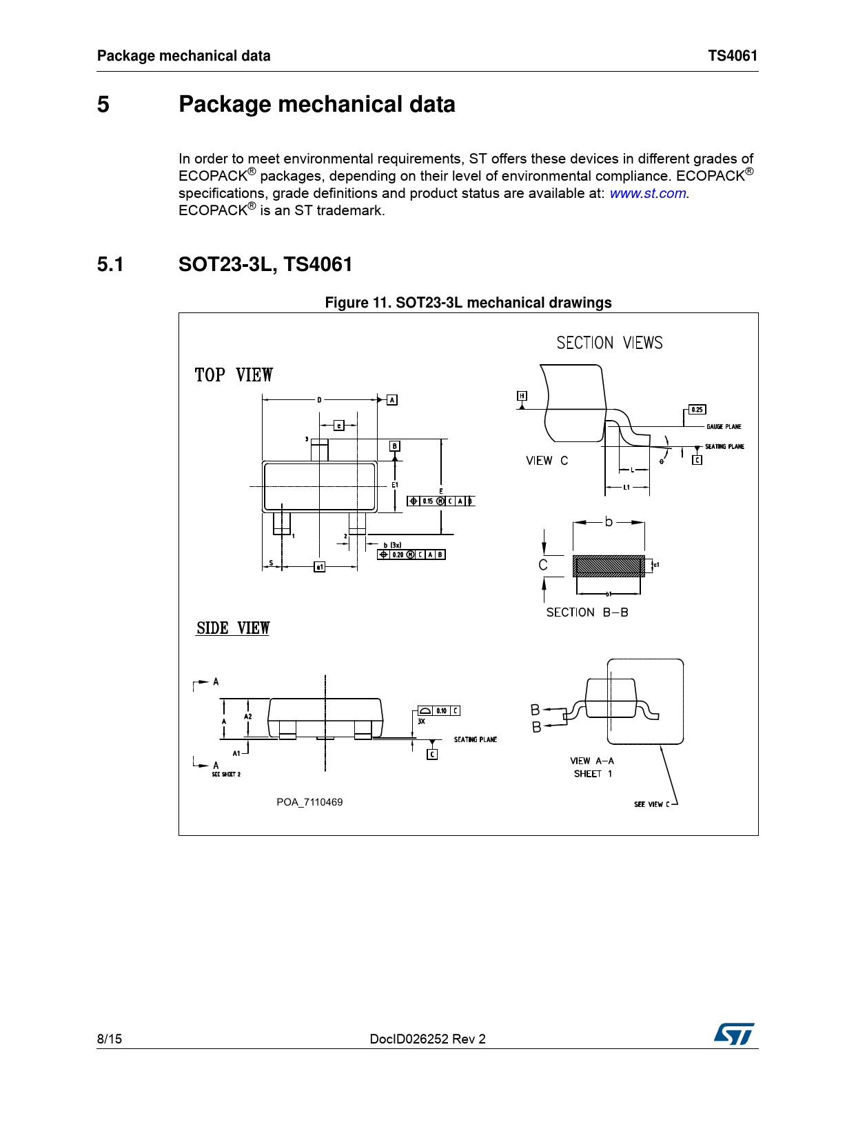 页数 / 页15 / 8 — Package mechanical data. TS4061. 5.1 SOT23-3L,. Figure 11. SOT23-3L …