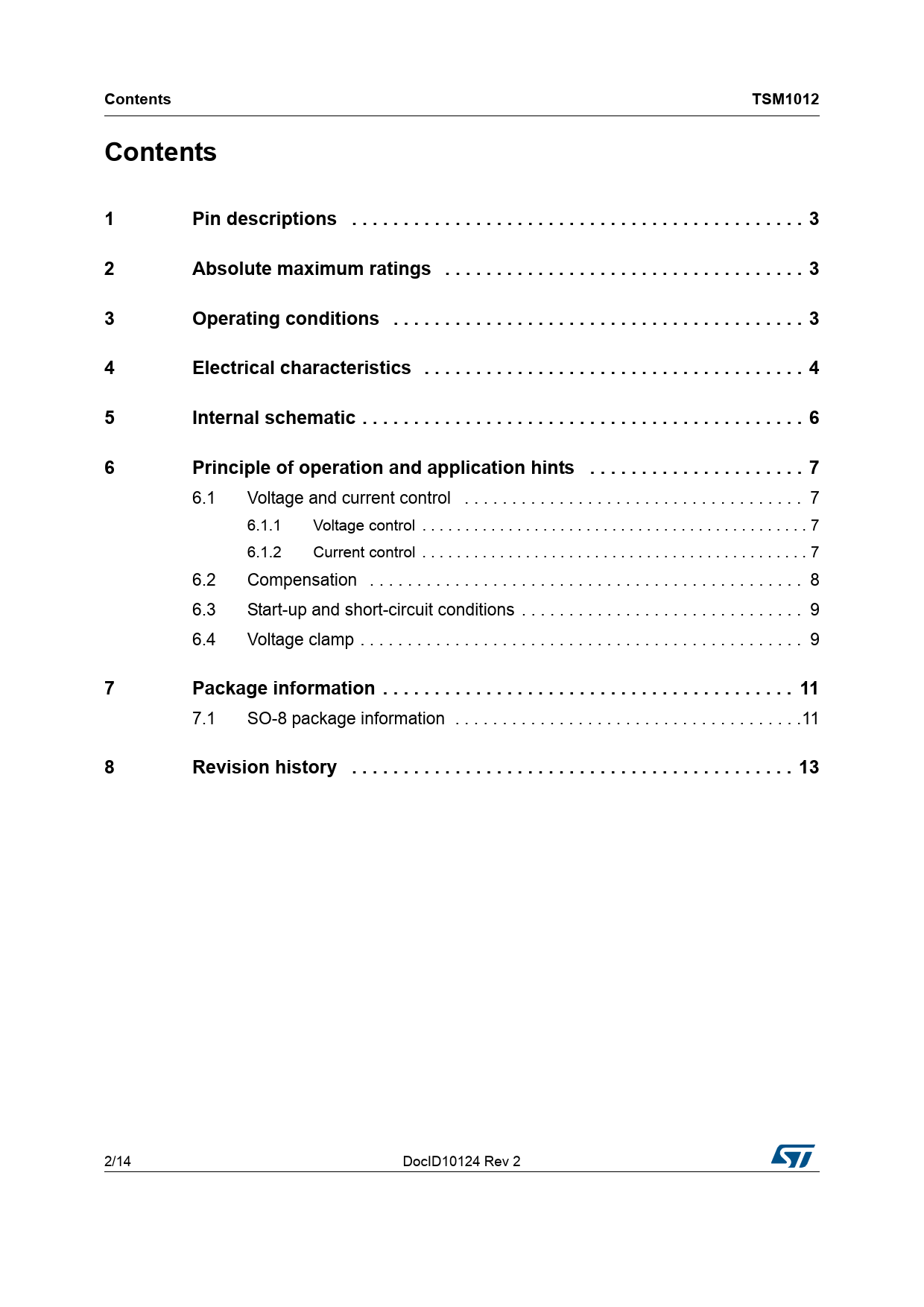 Contents TSM1012 Contents 1 Pin descriptions . 3 2 Absolute maximum ratings . 3 3 Operating conditions . 3 4 Electrical characteristics . 4 5 Internal schematic . 6 6 Principle of operation and application hints . 7