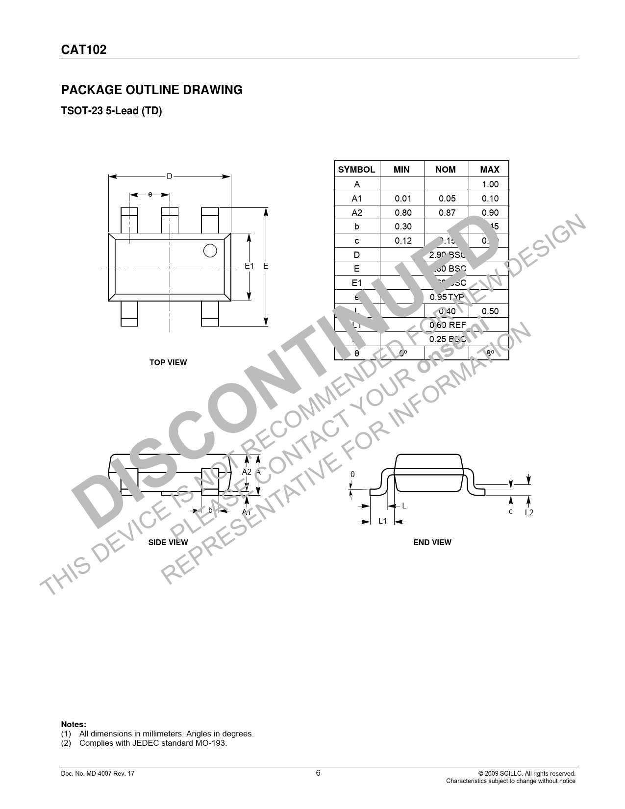 CAT102. PACKAGE OUTLINE DRAWING. TSOT-23 5-Lead (TD) (1). SYMBOL. MIN. NOM. MAX. TOP VIEW. onsemi. DISCONTINUED. SIDE VIEW. END VIEW. Notes: