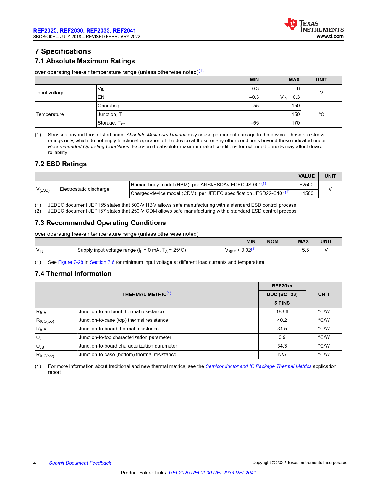 REF2025. , REF2030, REF2033, REF2041. www.ti.com. 7 Specifications 7.1 Absolute Maximum Ratings. MIN. MAX. UNIT. 7.2 ESD Ratings. VALUE