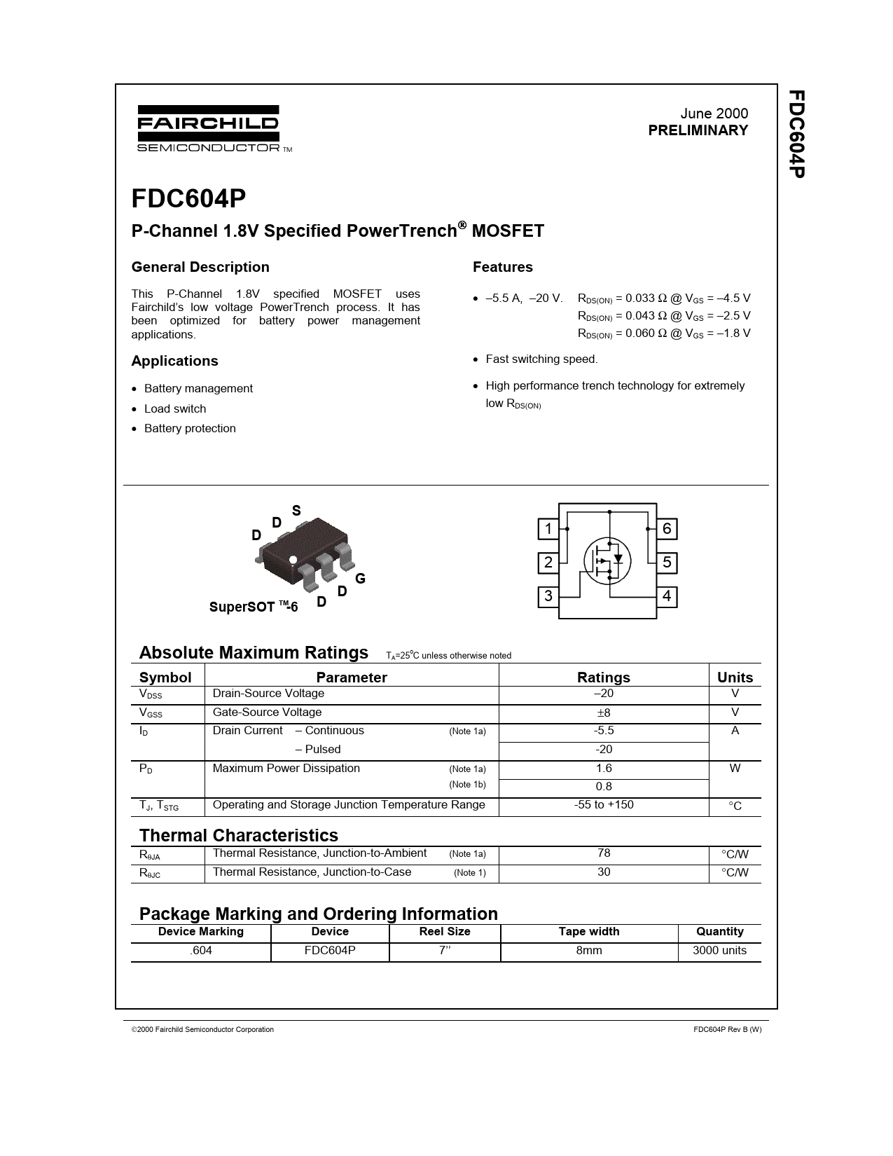 .604 FDC604P 7’’ 8mm 3000 units 2000 Fairchild Semiconductor Corporation FDC604P Rev B (W)