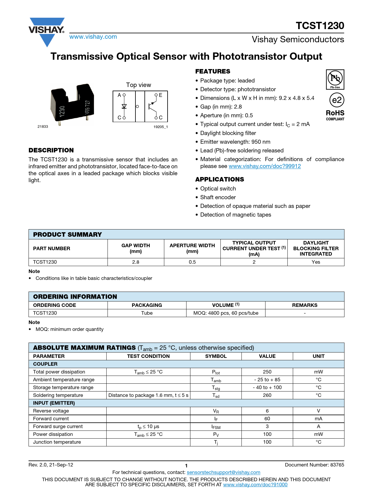 TCST1230 www.vishay.com Vishay Semiconductors Transmissive Optical Sensor with Phototransistor OutputFEATURES • Package type: leaded Top view • Detector type: phototransistor A E • Dimensions (L x W x H in mm): 9.2 x 4.8 x 5.4 • Gap (in mm): 2.8 • Aperture (in mm): 0.5 C C • Typical output current under test: I 21833 C = 2 mA 19205_1 • Daylight blocking filter • Emitter wavelength: 950 nm DESCRIPTION • Lead (Pb)-free soldering released The TCST1230 is a transmissive sensor that includes an • Material categorization: For definitions of compliance infrared emitter and phototransistor, located face-to-face on please see www.vishay.com/doc?99912 the optical axes in a leaded package which blocks visible light. APPLICATIONS • Optical switch • Shaft encoder • Detection of opaque material such as paper • Detection of magnetic tapes PRODUCT SUMMARYTYPICAL OUTPUTDAYLIGHTPART NUMBERGAP WIDTHAPERTURE WIDTH(mm)(mm)CURRENT UNDER TEST (1)BLOCKING FILTER(mA)INTEGRATED TCST1230 2.8 0.5 2 Yes Note • Conditions like in table basic characteristics/coupler ORDERING INFORMATION ORDERING CODEPACKAGINGVOLUME (1)REMARKS TCST1230 Tube MOQ: 4800 pcs, 60 pcs/tube - Note • MOQ: minimum order quantity ABSOLUTE MAXIMUM RATINGS (Tamb = 25 °C, unless otherwise specified) PARAMETERTEST CONDITIONSYMBOLVALUEUNITCOUPLER Total power dissipation Tamb ≤ 25 °C Ptot 250 mW Ambient temperature range Tamb - 25 to + 85 °C Storage temperature range Tstg - 40 to + 100 °C Soldering temperature Distance to package 1.6 mm, t ≤ 5 s Tsd 260 °C INPUT (EMITTER) Reverse voltage VR 6 V Forward current IF 60 mA Forward surge current tp ≤ 10 μs IFSM 3 A Power dissipation Tamb ≤ 25 °C PV 100 mW Junction temperature Tj 100 °C Rev. 2.0, 21-Sep-12 1 Document Number: 83765 For technical questions, contact: sensorstechsupport@vishay.com THIS DOCUMENT IS SUBJECT TO CHANGE WITHOUT NOTICE. THE PRODUCTS DESCRIBED HEREIN AND THIS DOCUMENT ARE SUBJECT TO SPECIFIC DISCLAIMERS, SET FORTH AT www.vishay.com/doc?91000
