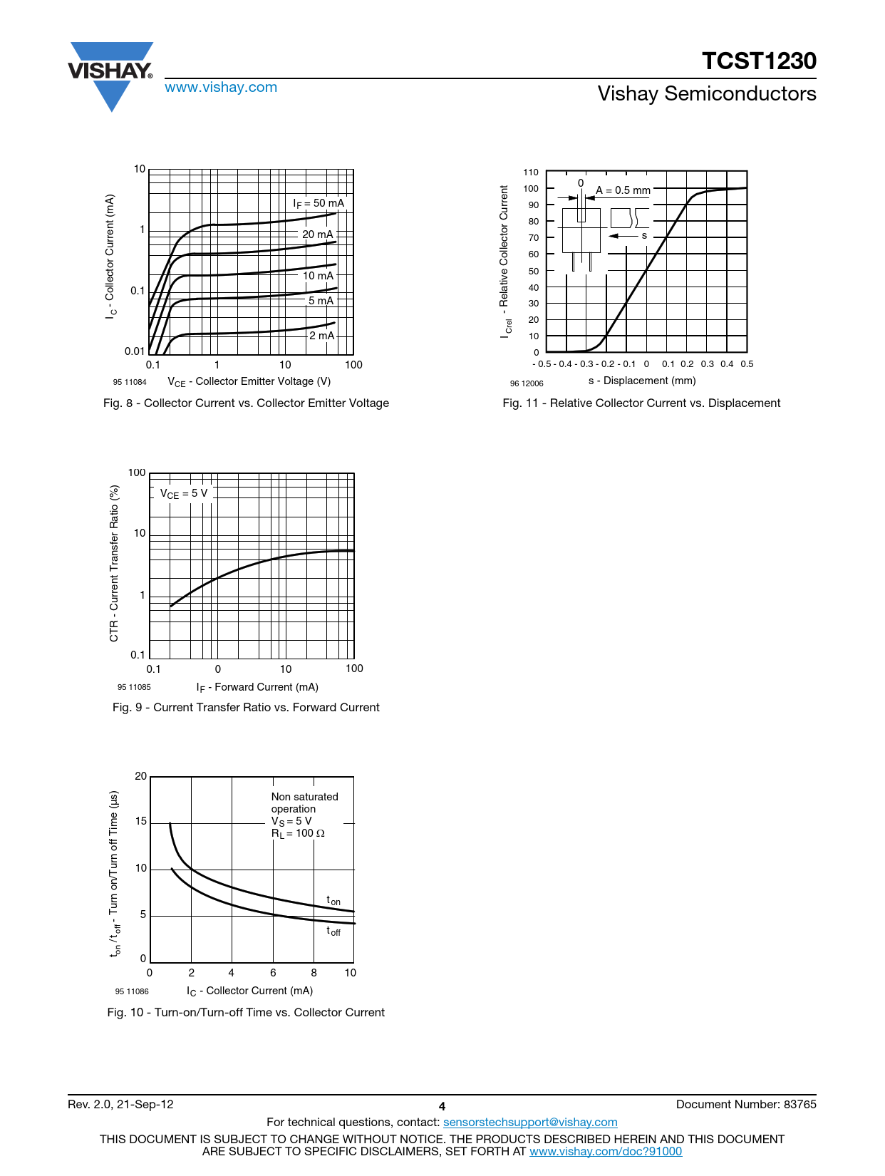 www.vishay.com Vishay Semiconductors 10 110 0 100 A = 0.5 mm I F = 50 mA 90 80 1 20 mA 70 s 60 10 mA 50 0.1 40 - Collector Current (mA) 5 mA 30 - Relative Collector Current I C 20 Crel 2 mA I 10 0.01 0 0.1 1 10 100 - 0.5 - 0.4 - 0.3 - 0.2 - 0.1 0 0.1 0.2 0.3 0.4 0.5 95 11084 V CE - Collector Emitter Voltage (V) 96 12006 s - Displacement (mm) Fig. 8 - Collector Current vs. Collector Emitter Voltage Fig. 11 - Relative Collector Current vs. Displacement 100 V CE = 5 V 10 1 CTR - Current Transfer Ratio (%) 0.1 0.1 0 10 100 95 11085 I F - Forward Current (mA) Fig. 9 - Current Transfer Ratio vs. Forward Current 20 Non saturated operation 15 V S = 5 V R L = 100 Ω 10 /Turn off Time (µs) t on - Turn on 5 off t off / t t on 0 0 2 4 6 8 10 95 11086 I C - Collector Current (mA) Fig. 10 - Turn-on/Turn-off Time vs. Collector Current Rev. 2.0, 21-Sep-12