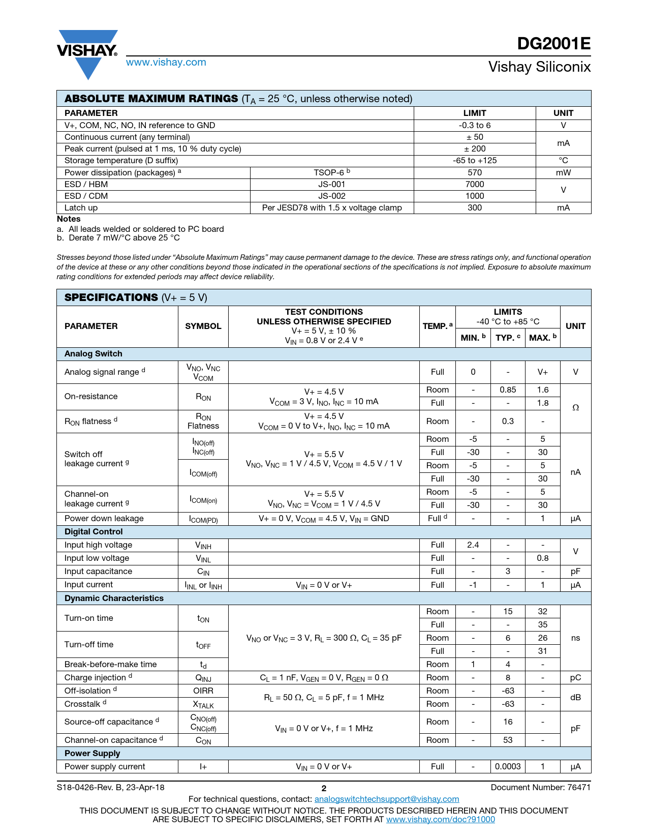 DG2001E. ABSOLUTE MAXIMUM RATINGS. PARAMETER. LIMIT. UNIT. Notes. SPECIFICATIONS. TEST CONDITIONS. LIMITS. UNLESS OTHERWISE SPECIFIED