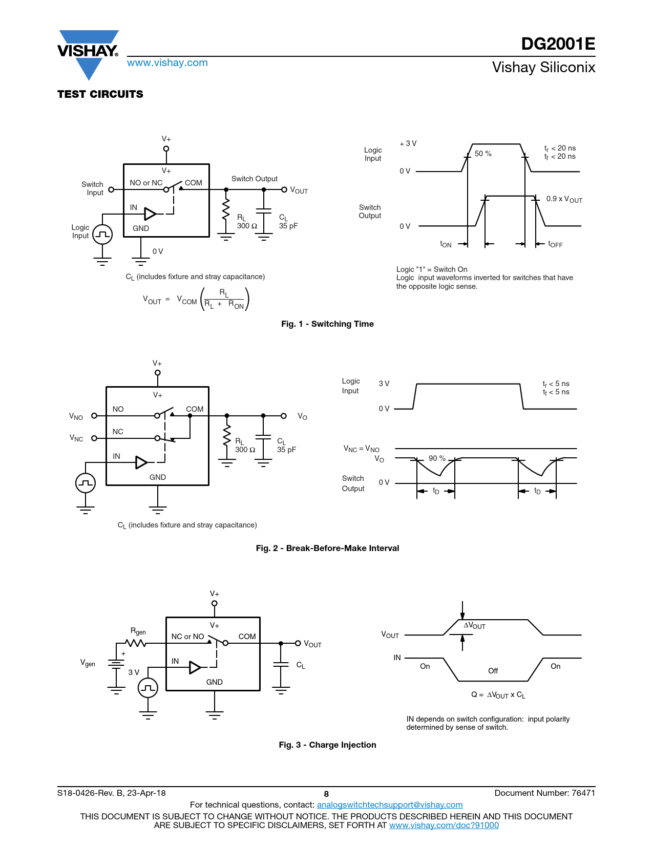 DG2001E www.vishay.com Vishay Siliconix TEST CIRCUITS V+ + 3 V Logic tr < 20 ns 50 % Input tf < 20 ns V+ 0 V Switch Output Switch NO or NC COM Input VOUT 0.9 x VOUT IN Switch R C Output L L 300 Ω 35 pF Logic GND 0 V Input tON tOFF 0 V Logic "1" = Switch On CL (includes fixture and stray capacitance) Logic input waveforms inverted for switches that have the opposite logic sense. R V = V L OUT COM R + R L ON Fig. 1 - Switching Time V+ Logic 3 V tr < 5 ns Input tf < 5 ns V+ NO COM 0 V VNO VO NC VNC R C L L V 300 Ω 35 pF NC = VNO IN VO 90 % GND Switch 0 V Output tD tD CL (includes fixture and stray capacitance) Fig. 2 - Break-Before-Make Interval V+ V+ ΔVOUT Rgen V NC or NO COM OUT VOUT + IN V IN gen CL On On Off 3 V GND Q = ΔVOUT x CL IN depends on switch configuration: input polarity determined by sense of switch. Fig. 3 - Charge Injection S18-0426-Rev. B, 23-Apr-18 8 Document Number: 76471 For technical questions, contact: analogswitchtechsupport@vishay.com THIS DOCUMENT IS SUBJECT TO CHANGE WITHOUT NOTICE. THE PRODUCTS DESCRIBED HEREIN AND THIS DOCUMENT ARE SUBJECT TO SPECIFIC DISCLAIMERS, SET FORTH AT www.vishay.com/doc?91000