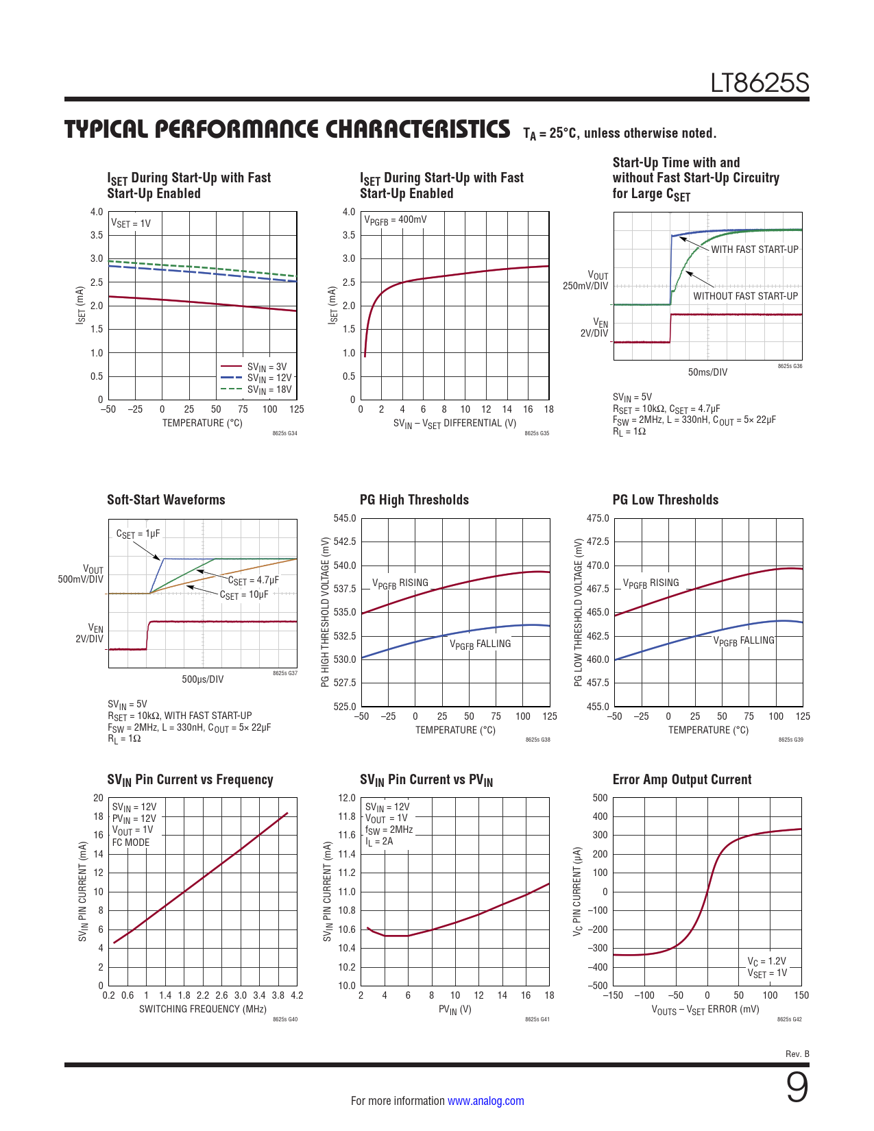 4.0 4.0 VSET = 1V VPGFB = 400mV 3.5 3.5 WITH FAST START-UP 3.0 3.0 V 2.5 2.5 OUT 250mV/DIV WITHOUT FAST START-UP (mA) 2.0 (mA) 2.0 I SET I SET V 1.5 1.5 EN 2V/DIV 1.0 1.0 SVIN = 3V 8625s G36 0.5 SV 50ms/DIV IN = 12V 0.5 SVIN = 18V 0 0 SVIN = 5V –50 –25 0 25 50 75 100 125 0 2 4 6 8 10 12 14 16 18 RSET = 10kΩ, CSET = 4.7µF TEMPERATURE (°C) SV F IN – VSET DIFFERENTIAL (V) SW = 2MHz, L = 330nH, COUT = 5× 22µF 8625s G34 8625s G35 RL = 1Ω