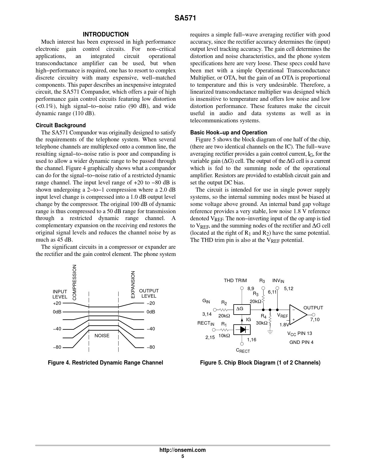link to page 5 link to page 5 SA571INTRODUCTION requires a simple full−wave averaging rectifier with good Much interest has been expressed in high performance accuracy, since the rectifier accuracy determines the (input) electronic gain control circuits. For non−critical output level tracking accuracy. The gain cell determines the applications, an integrated circuit operational distortion and noise characteristics, and the phone system transconductance amplifier can be used, but when specifications here are very loose. These specs could have high−performance is required, one has to resort to complex been met with a simple Operational Transconductance discrete circuitry with many expensive, well−matched Multiplier, or OTA, but the gain of an OTA is proportional components. This paper describes an inexpensive integrated to temperature and this is very undesirable. Therefore, a circuit, the SA571 Compandor, which offers a pair of high linearized transconductance multiplier was designed which performance gain control circuits featuring low distortion is insensitive to temperature and offers low noise and low (<0.1%), high signal−to−noise ratio (90 dB), and wide distortion performance. These features make the circuit dynamic range (110 dB). useful in audio and data systems as well as in telecommunications systems. Circuit Background The SA571 Compandor was originally designed to satisfy Basic Hook−up and Operation the requirements of the telephone system. When several Figure 5 shows the block diagram of one half of the chip, telephone channels are multiplexed onto a common line, the (there are two identical channels on the IC). The full−wave resulting signal−to−noise ratio is poor and companding is averaging rectifier provides a gain control current, IG, for the used to allow a wider dynamic range to be passed through variable gain (DG) cell. The output of the DG cell is a current the channel. Figure 4 graphically shows what a compandor which is fed to the summing node of the operational can do for the signal−to−noise ratio of a restricted dynamic amplifier. Resistors are provided to establish circuit gain and range channel. The input level range of +20 to −80 dB is set the output DC bias. shown undergoing a 2−to−1 compression where a 2.0 dB The circuit is intended for use in single power supply input level change is compressed into a 1.0 dB output level systems, so the internal summing nodes must be biased at change by the compressor. The original 100 dB of dynamic some voltage above ground. An internal band gap voltage range is thus compressed to a 50 dB range for transmission reference provides a very stable, low noise 1.8 V reference through a restricted dynamic range channel. A denoted VREF. The non−inverting input of the op amp is tied complementary expansion on the receiving end restores the to VREF, and the summing nodes of the rectifier and DG cell original signal levels and reduces the channel noise by as (located at the right of R1 and R2) have the same potential. much as 45 dB. The THD trim pin is also at the VREF potential. The significant circuits in a compressor or expander are the rectifier and the gain control element. The phone system THD TRIM R INV 3 IN ANSION 8,9 5,12 INPUT OUTPUT R 6,11 LEVEL LEVEL 3 COMPRESSION EXP G +20 −20 IN R 20kW 2 OUTPUT DG − 0dB 0dB 3,14 20kW R VREF 4 IG + 7,10 RECTIN R 30kW 1 1.8V −40 −40 V NOISE CC PIN 13 10kW 2,15 1,16 GND PIN 4 −80 −80 CRECT Figure 4. Restricted Dynamic Range ChannelFigure 5. Chip Block Diagram (1 of 2 Channels)http://onsemi.com5