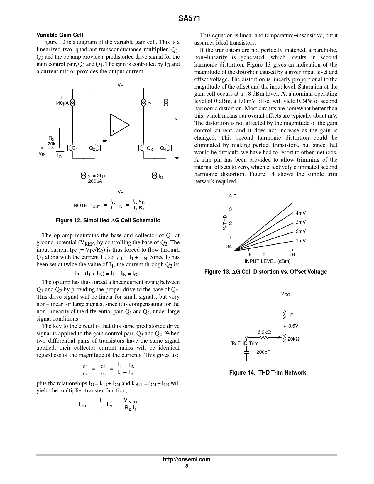 link to page 8 link to page 8 link to page 8 SA571Variable Gain Cell This equation is linear and temperature−insensitive, but it Figure 12 is a diagram of the variable gain cell. This is a assumes ideal transistors. linearized two−quadrant transconductance multiplier. Q1, If the transistors are not perfectly matched, a parabolic, Q2 and the op amp provide a predistorted drive signal for the non−linearity is generated, which results in second gain control pair, Q3 and Q4. The gain is controlled by IG and harmonic distortion. Figure 13 gives an indication of the a current mirror provides the output current. magnitude of the distortion caused by a given input level and offset voltage. The distortion is linearly proportional to the V+ magnitude of the offset and the input level. Saturation of the gain cell occurs at a +8 dBm level. At a nominal operating I1 140mA level of 0 dBm, a 1.0 mV offset will yield 0.34% of second harmonic distortion. Most circuits are somewhat better than this, which means our overall offsets are typically about mV. − The distortion is not affected by the magnitude of the gain + control current, and it does not increase as the gain is R2 changed. This second harmonic distortion could be 20k eliminated by making perfect transistors, but since that Q1 Q2 Q3 Q4 V would be difficult, we have had to resort to other methods. IN IIN A trim pin has been provided to allow trimming of the internal offsets to zero, which effectively eliminated second I harmonic distortion. Figure 14 shows the simple trim 2 (= 2I1) IG 280mA network required. V− 4 I I V G G IN NOTE: I + I + OUT I IN I R 1 2 2 3 4mV Figure 12. Simplified D G Cell Schematic 2 3mV % THD 2mV The op amp maintains the base and collector of Q1 at 1 ground potential (V 1mV REF) by controlling the base of Q2. The .34 input current IIN (= VIN/R2) is thus forced to flow through Q −6 0 +6 1 along with the current I1, so IC1 = I1 + IIN. Since I2 has INPUT LEVEL (dBm) been set at twice the value of I1, the current through Q2 is: I Figure 13. D G Cell Distortion vs. Offset Voltage 2 − (I1 + IIN) = I1 − IIN = IC2. The op amp has thus forced a linear current swing between Q1 and Q2 by providing the proper drive to the base of Q2. V This drive signal will be linear for small signals, but very CC non−linear for large signals, since it is compensating for the non−linearity of the differential pair, Q1 and Q2, under large R signal conditions. The key to the circuit is that this same predistorted drive 3.6V signal is applied to the gain control pair, Q 6.2kW 3 and Q4. When two differential pairs of transistors have the same signal 20kW To THD Trim applied, their collector current ratios will be identical ≈200pF regardless of the magnitude of the currents. This gives us: I I I ) I C1 + C4 + 1 IN I I I * I C2 C3 1 IN Figure 14. THD Trim Network plus the relationships IG = IC3 + IC4 and IOUT = IC4 − IC3 will yield the multiplier transfer function, I V I I + G I + IN G OUT I IN R I 1 2 1 http://onsemi.com8