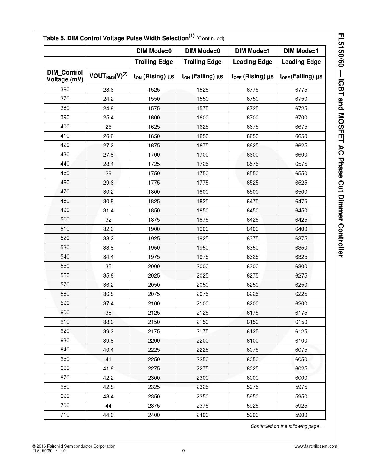 Voltage (mV) VOUTRMS(V)(2) tON (Rising) s tON (Falling)s tOFF (Rising) s tOFF (Falling) s 360 23.6 1525 1525 6775 6775 370 24.2 1550 1550 6750 6750 380 24.8 1575 1575 6725 6725 390 25.4 1600 1600 6700 6700 400 26 1625 1625 6675 6675 410 26.6 1650 1650 6650 6650 420 27.2 1675 1675 6625 6625 430 27.8 1700 1700 6600 6600 440 28.4 1725 1725 6575 6575 450 29 1750 1750 6550 6550 460 29.6 1775 1775 6525 6525 470 30.2 1800 1800 6500 6500 480 30.8 1825 1825 6475 6475 490 31.4 1850 1850 6450 6450 500 32 1875 1875 6425 6425 510 32.6 1900 1900 6400 6400 520 33.2 1925 1925 6375 6375 530 33.8 1950 1950 6350 6350 540 34.4 1975 1975 6325 6325 550 35 2000 2000 6300 6300 560 35.6 2025 2025 6275 6275 570 36.2 2050 2050 6250 6250 580 36.8 2075 2075 6225 6225 590 37.4 2100 2100 6200 6200 600 38 2125 2125 6175 6175 610 38.6 2150 2150 6150 6150 620 39.2 2175 2175 6125 6125 630 39.8 2200 2200 6100 6100 640 40.4 2225 2225 6075 6075 650 41 2250 2250 6050 6050 660 41.6 2275 2275 6025 6025 670 42.2 2300 2300 6000 6000 680 42.8 2325 2325 5975 5975 690 43.4 2350 2350 5950 5950 700 44 2375 2375 5925 5925 710 44.6 2400 2400 5900 5900 FL5150/60 — IGBT and MOSFET AC Phase Cut Dimmer Controller Table 5. DIM Control Voltage Pulse Width Selection Continued on the following page… © 2016 Fairchild Semiconductor Corporation