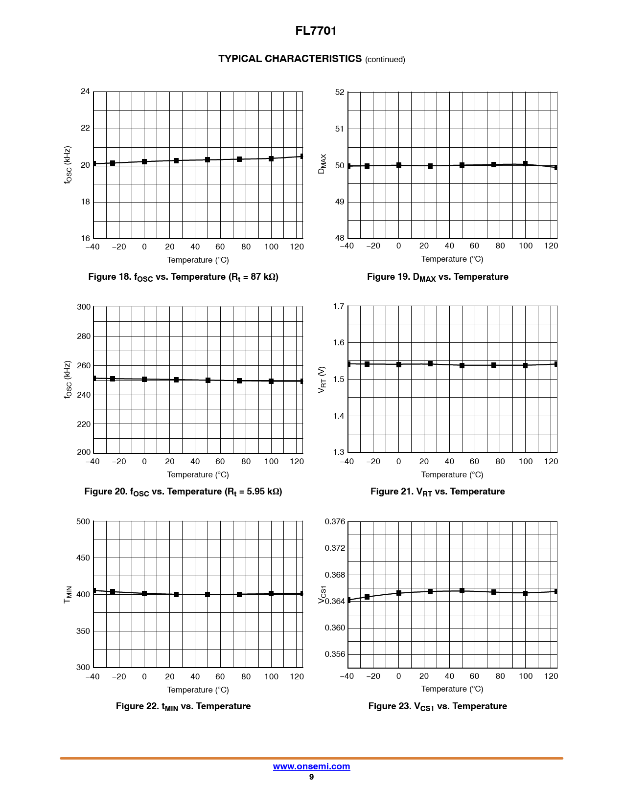 FL7701. TYPICAL CHARACTERISTICS. Figure 18. fOSC vs. Temperature (Rt = 87 kW). Figure 19. DMAX vs. Temperature
