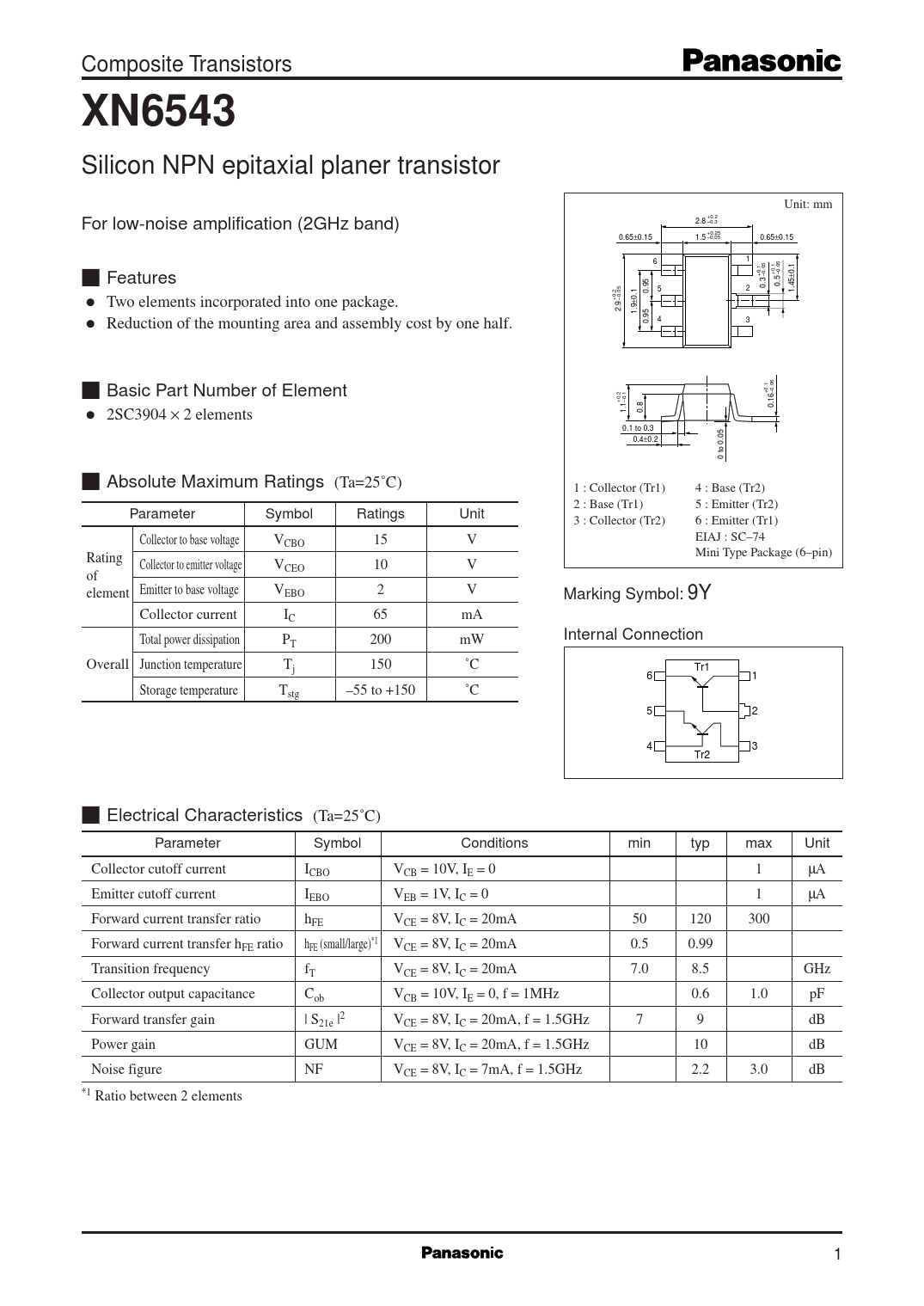 Silicon NPN epitaxial planer transistor Unit: mm +0.2 For low-noise amplification (2GHz band) 2.8 –0.3 +0.25 0.65±0.15 1.5 –0.05 0.65±0.15 1 6 ■ Features +0.1 –0.05 +0.1 –0.05 ±0.1 0.3 0.5 5 2 0.95 1.45 ● Two elements incorporated into one package. +0.2 –0.05 ±0.1 2.9 1.9 ● Reduction of the mounting area and assembly cost by one half. 4 0.95 3 ■ Basic Part Number of Element +0.1 –0.06 +0.2 –0.1 0.16 ● 2SC3904 × 2 elements 1.1 0.8 0.1 to 0.3 0.4±0.2 0 to 0.05 ■ Absolute Maximum Ratings (Ta=25˚C) 1 : Collector (Tr1) 4 : Base (Tr2) 2 : Base (Tr1) 5 : Emitter (Tr2) Parameter Symbol Ratings Unit 3 : Collector (Tr2) 6 : Emitter (Tr1) Collector to base voltage V EIAJ : SC–74 CBO 15 V Rating Mini Type Package (6–pin) Collector to emitter voltage VCEO 10 V of Emitter to base voltage V element EBO 2 V Marking Symbol: 9Y Collector current IC 65 mA Internal Connection Total power dissipation PT 200 mW Overall Junction temperature Tj 150 ˚C Tr1 6 1 Storage temperature Tstg –55 to +150 ˚C 5 2 4 3 Tr2 ■ Electrical Characteristics (Ta=25˚C) Parameter Symbol Conditions min typ max Unit Collector cutoff current ICBO VCB = 10V, IE = 0 1 µA Emitter cutoff current IEBO VEB = 1V, IC = 0 1 µA Forward current transfer ratio hFE VCE = 8V, IC = 20mA 50 120 300 Forward current transfer hFE ratio hFE (small/large)*1 VCE = 8V, IC = 20mA 0.5 0.99 Transition frequency fT VCE = 8V, IC = 20mA 7.0 8.5 GHz Collector output capacitance Cob VCB = 10V, IE = 0, f = 1MHz 0.6 1.0 pF Forward transfer gain | S21e |2 VCE = 8V, IC = 20mA, f = 1.5GHz 7 9 dB Power gain GUM VCE = 8V, IC = 20mA, f = 1.5GHz 10 dB Noise figure NF VCE = 8V, IC = 7mA, f = 1.5GHz 2.2 3.0 dB *1 Ratio between 2 elements 1